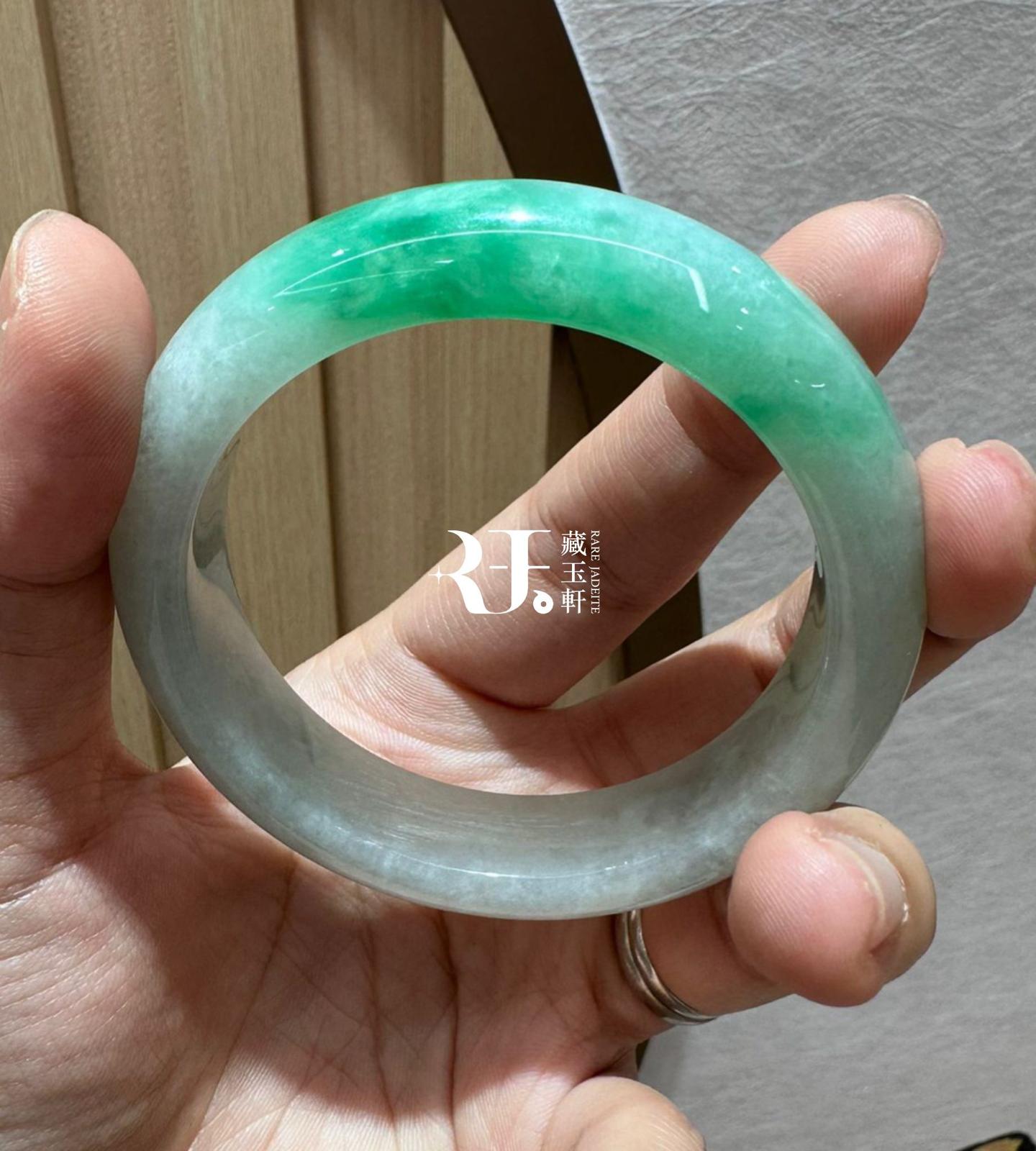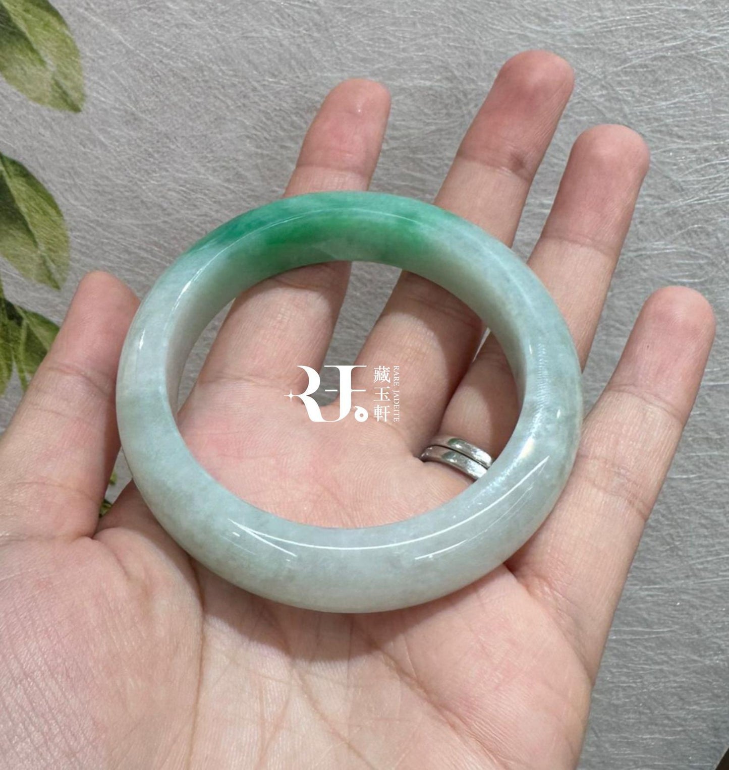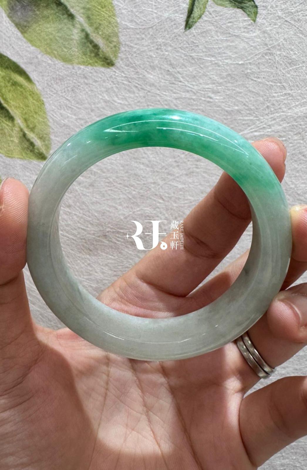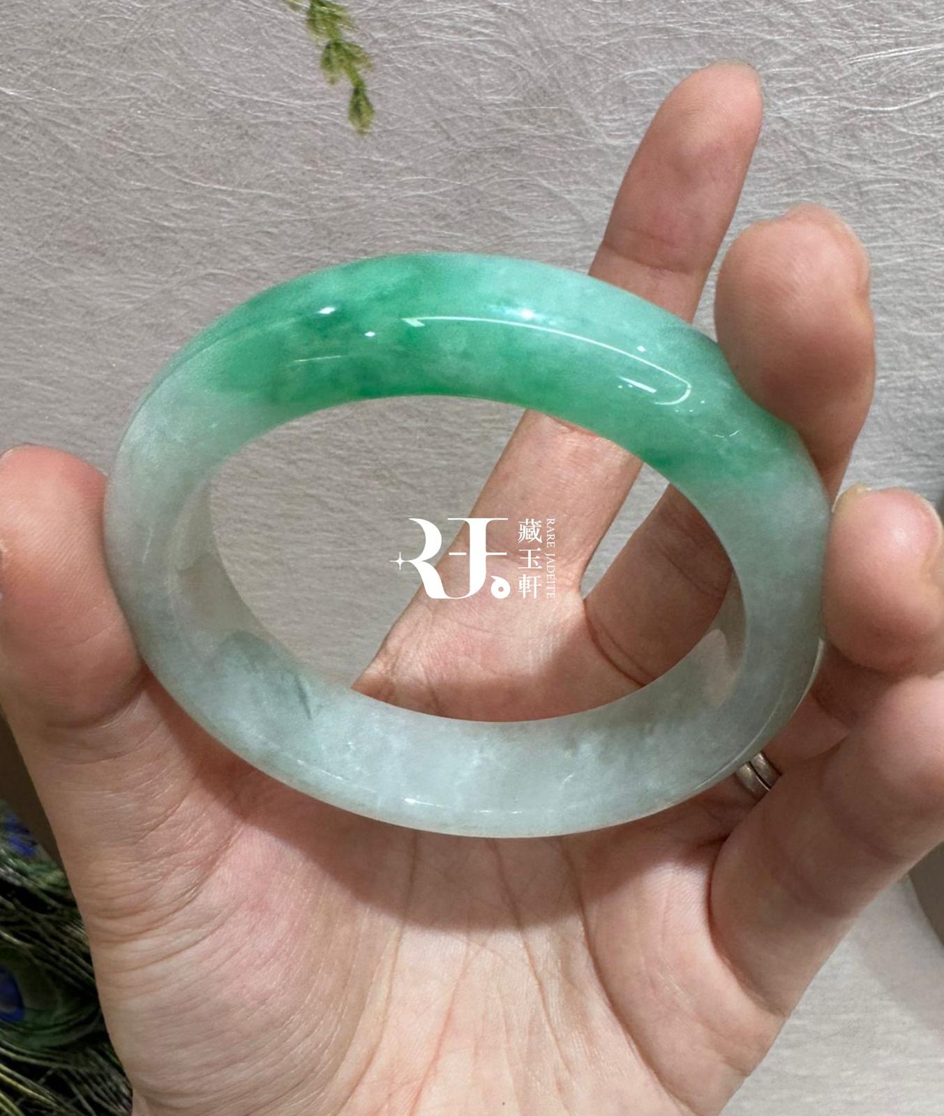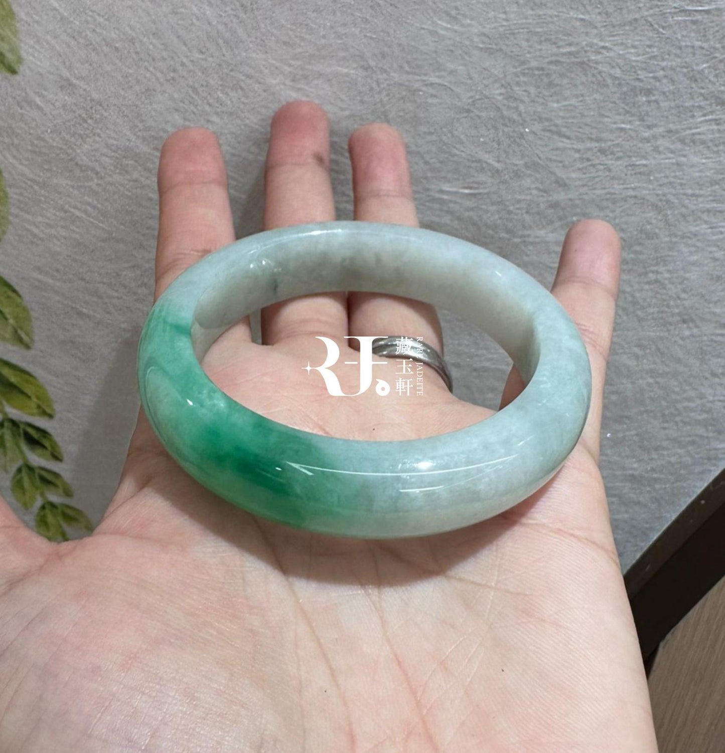 細糯冰種甜甜飄陽綠正圈,半山半水般,色澤濃郁漂亮,色溶於底,讓人怦然心動!