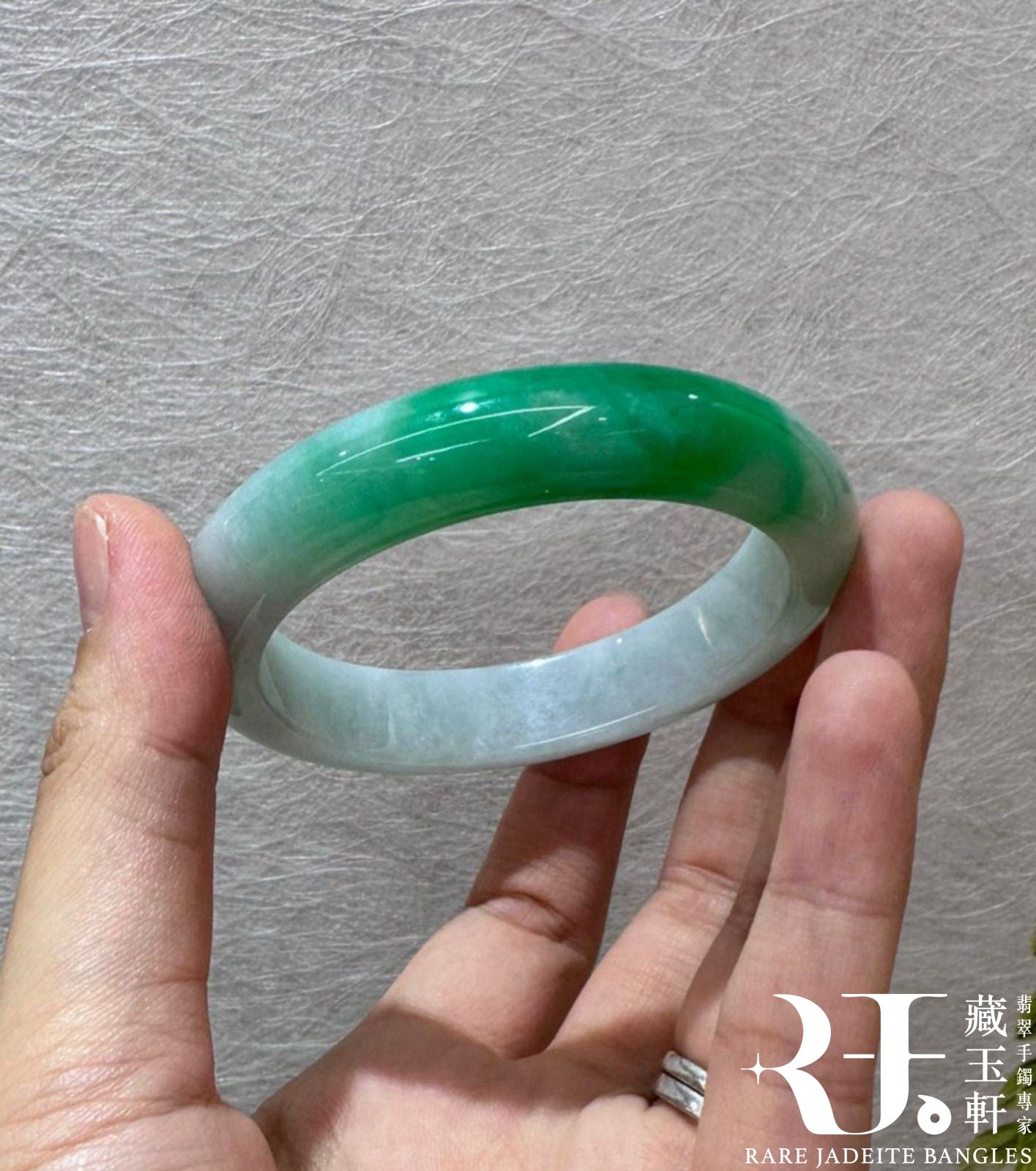 白底青圓條手鐲,奶白底飄正陽綠,底子乾淨清爽,色澤青翠清新,漂亮讓人怦然心動!