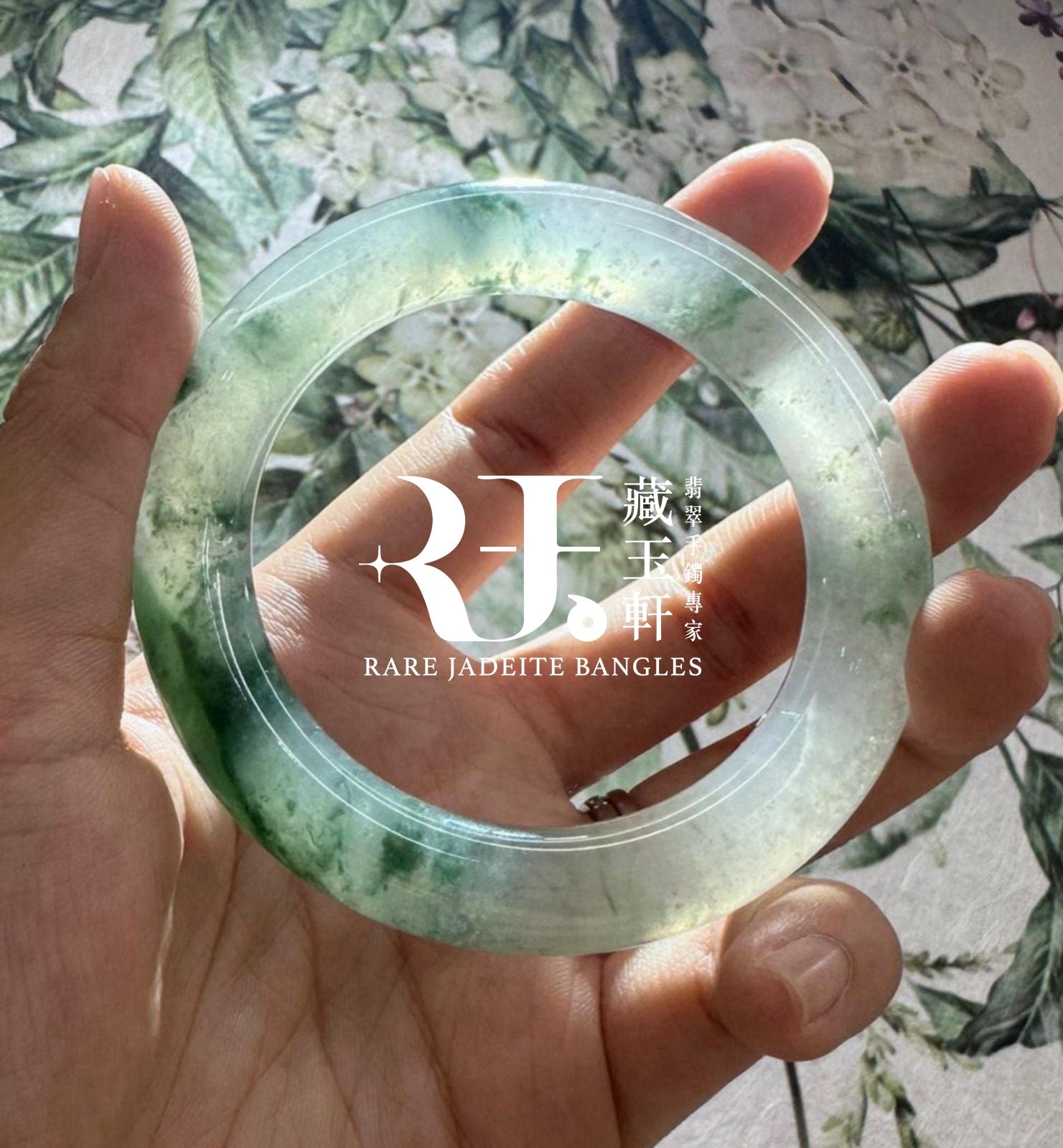 冰玻璃種飄花圓條手鐲,草綠飄花色澤鮮豔漂亮,讓人怦然心動!
