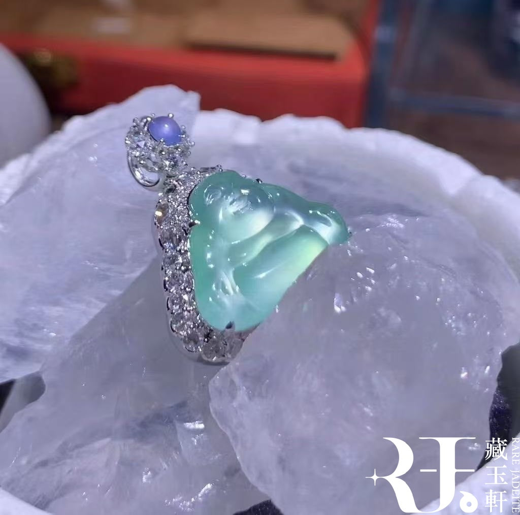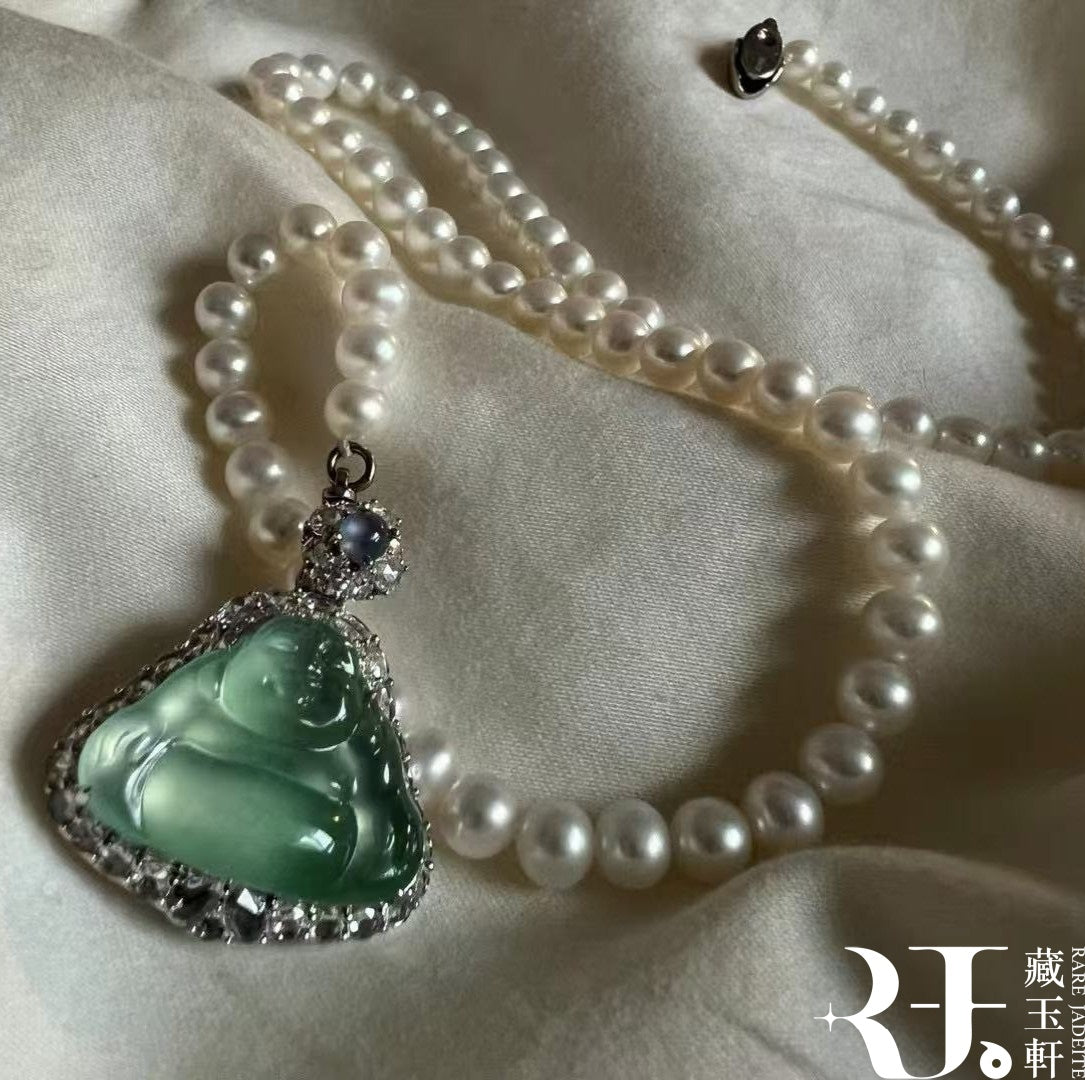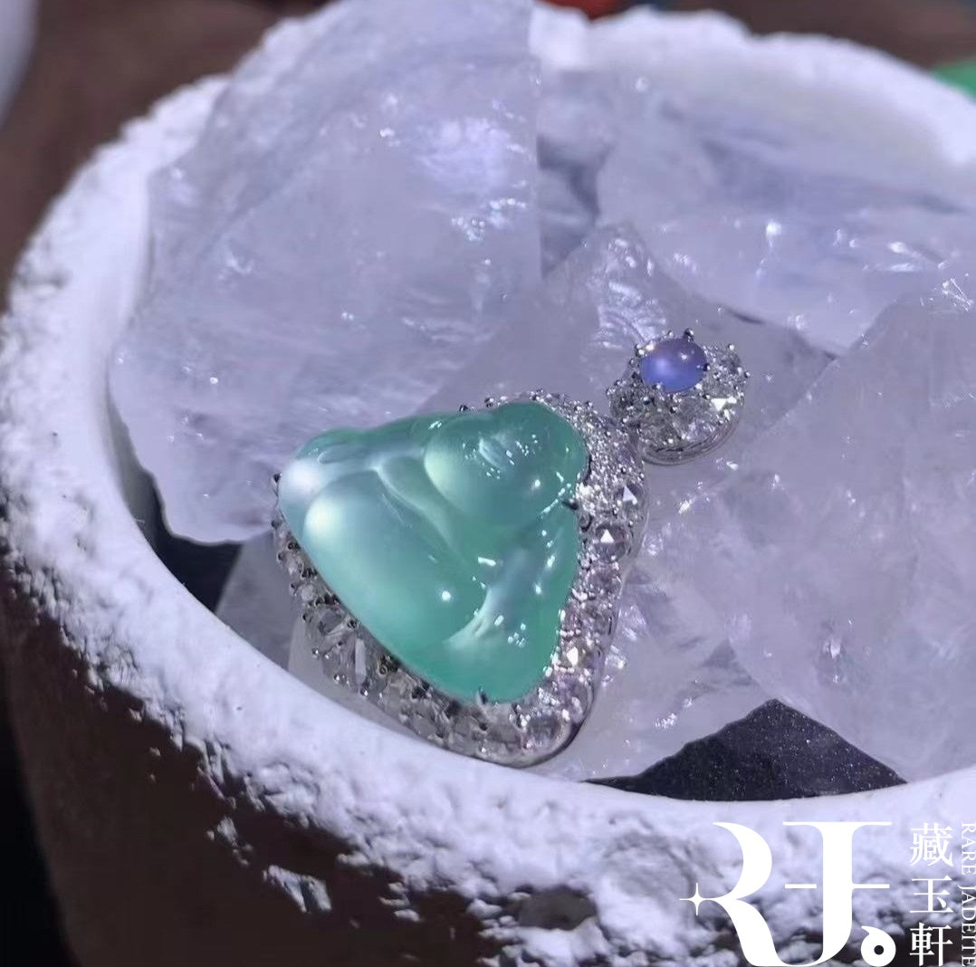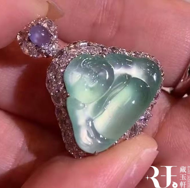 叩頭處搭配高冰紫蛋面翡翠點綴及18K伴鑽配鉑金鍊,佩戴起來沁人心扉,美豔動人。