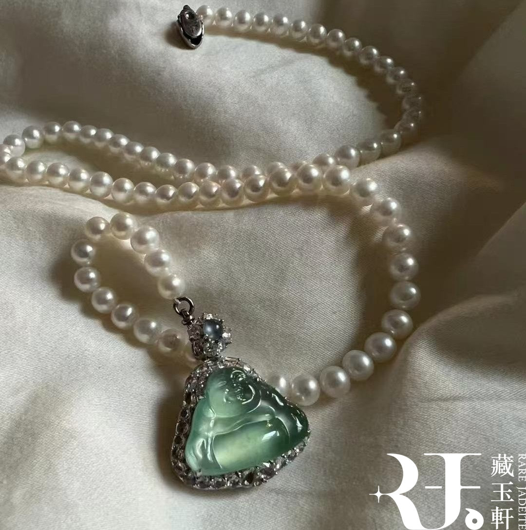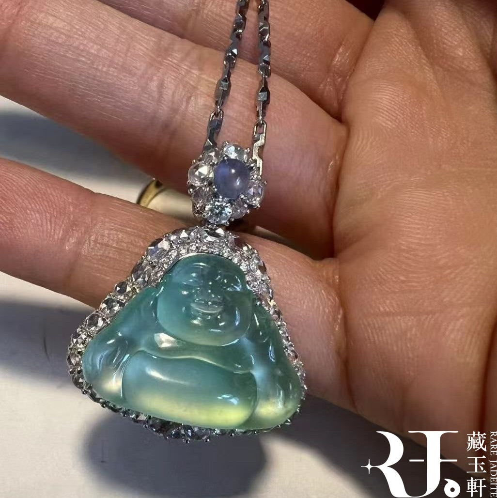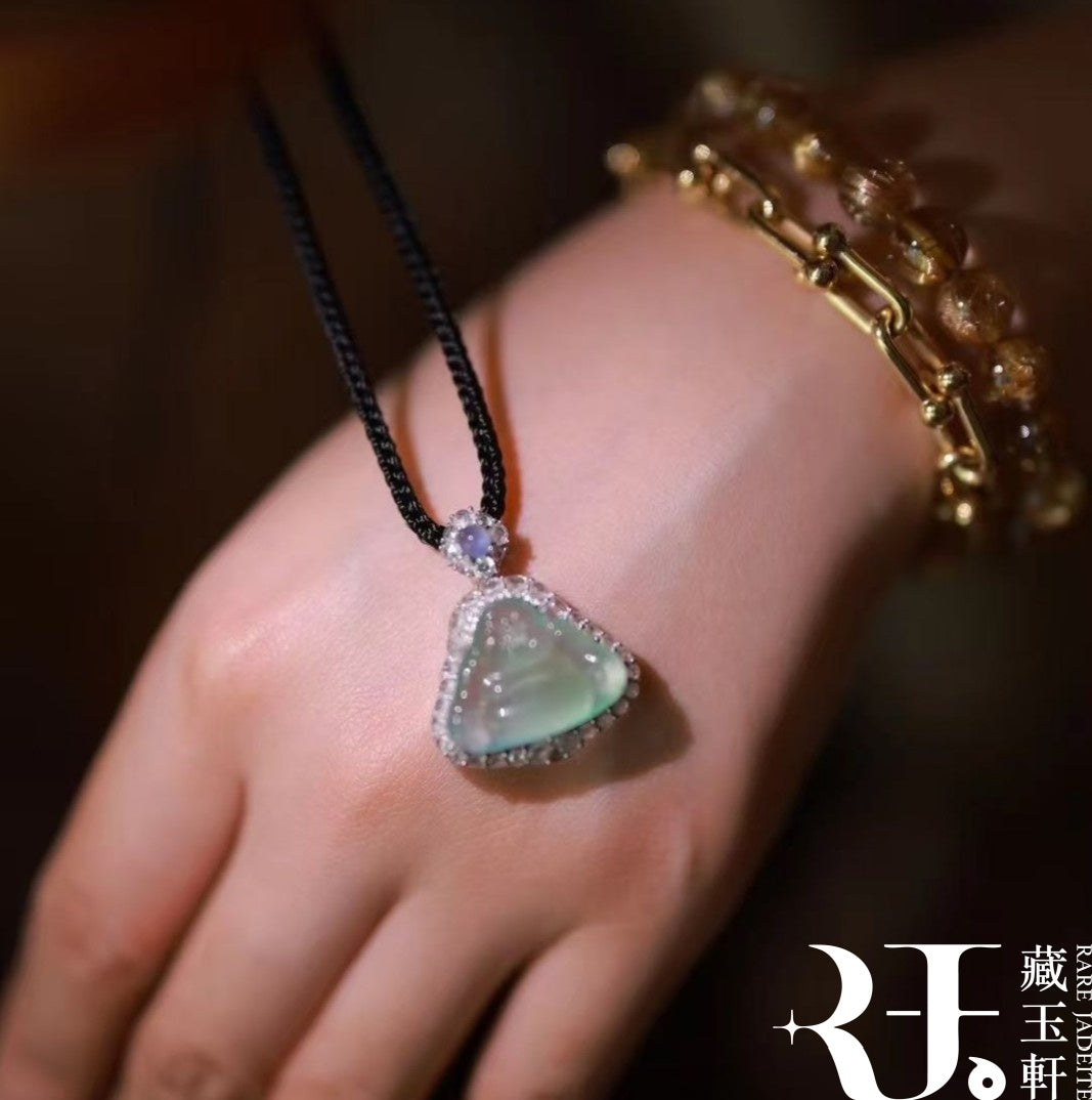 叩頭處搭配高冰紫蛋面翡翠點綴及18K伴鑽配鉑金鍊,佩戴起來沁人心扉,美豔動人。