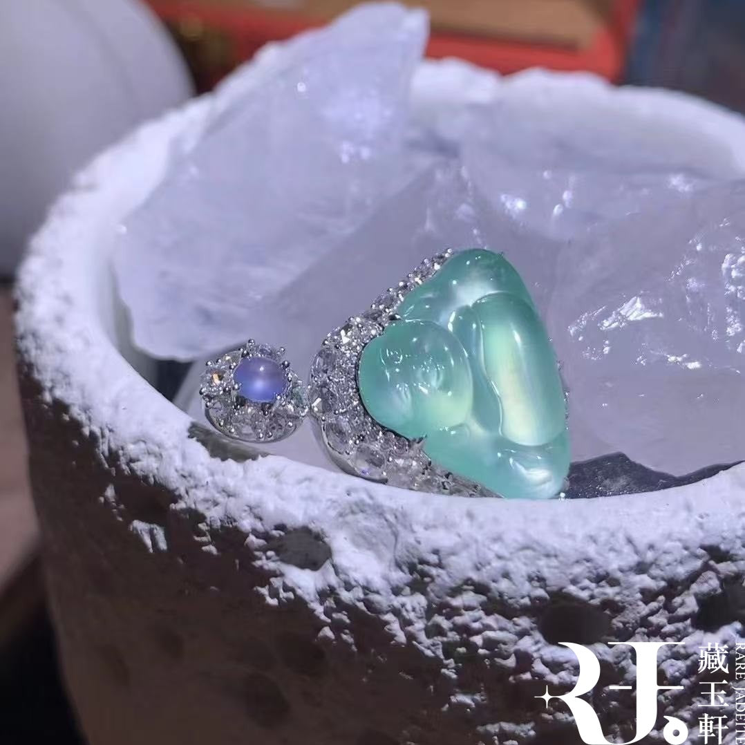 高冰種木那雪花棉,甜甜薄荷綠,飄著繁花雪景,色澤漂亮清透水亮,玉質種老細膩起螢起光,整體水潤飽滿,膠感十足。