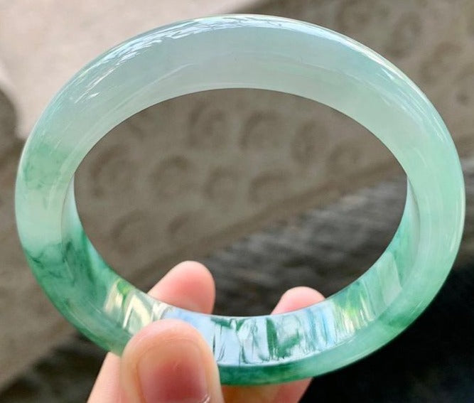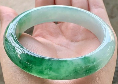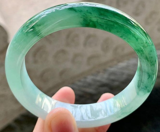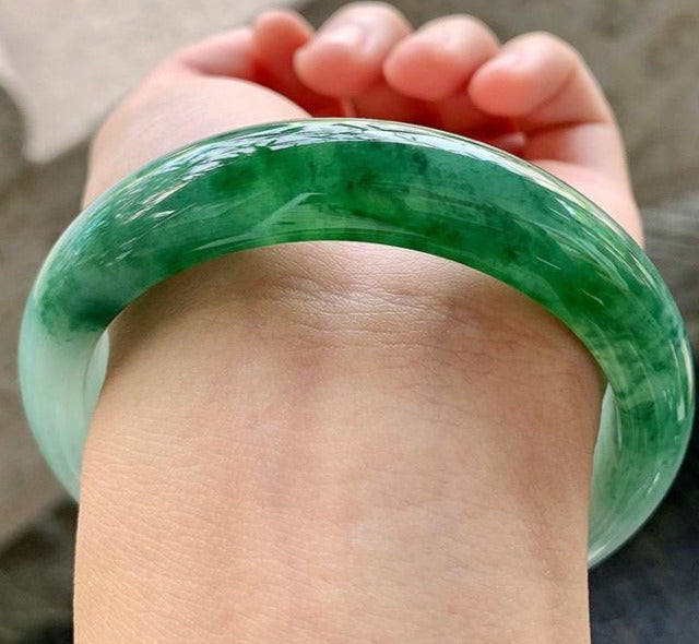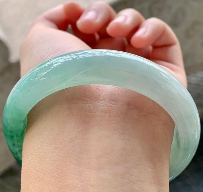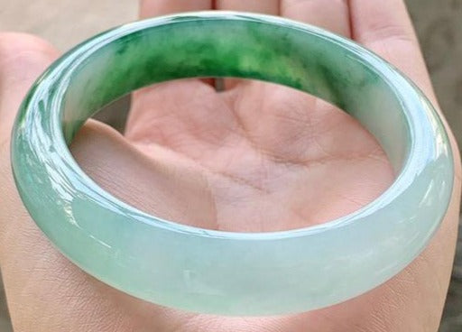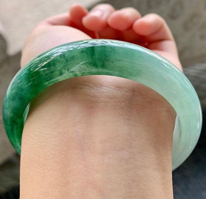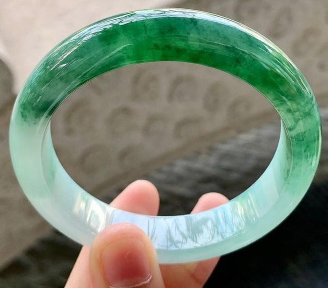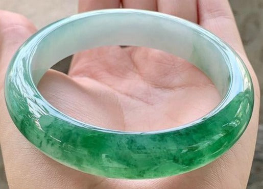 高冰種晴水底,飄著辣陽綠色,色溶於底,飄花靈動,有如半山半水般,清雅怡人。
