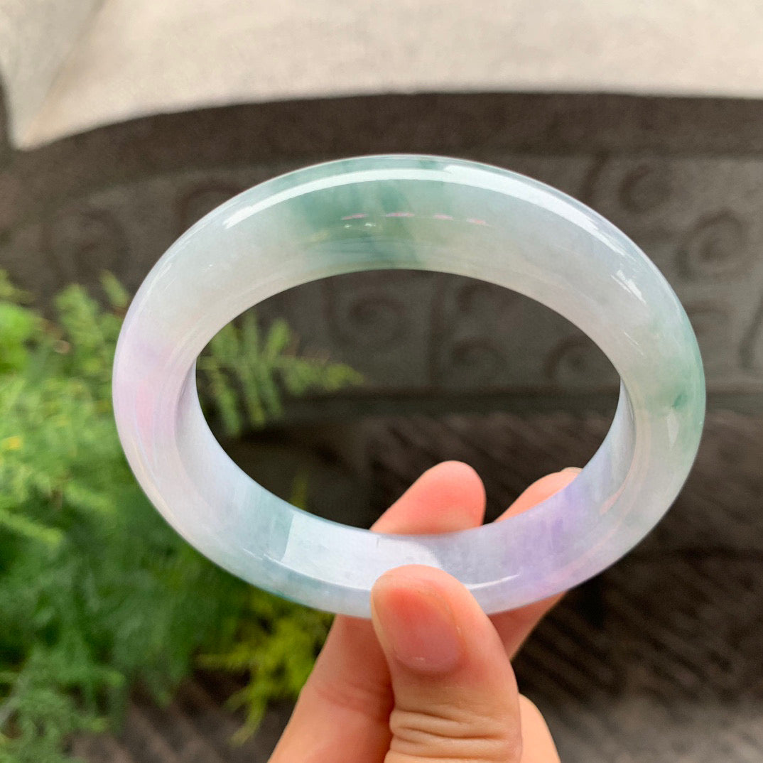 冰種春彩飄花正圈手鐲,底妝純淨,俏麗粉紫色,陽綠青翠明豔,漂亮得讓人怦然心動!