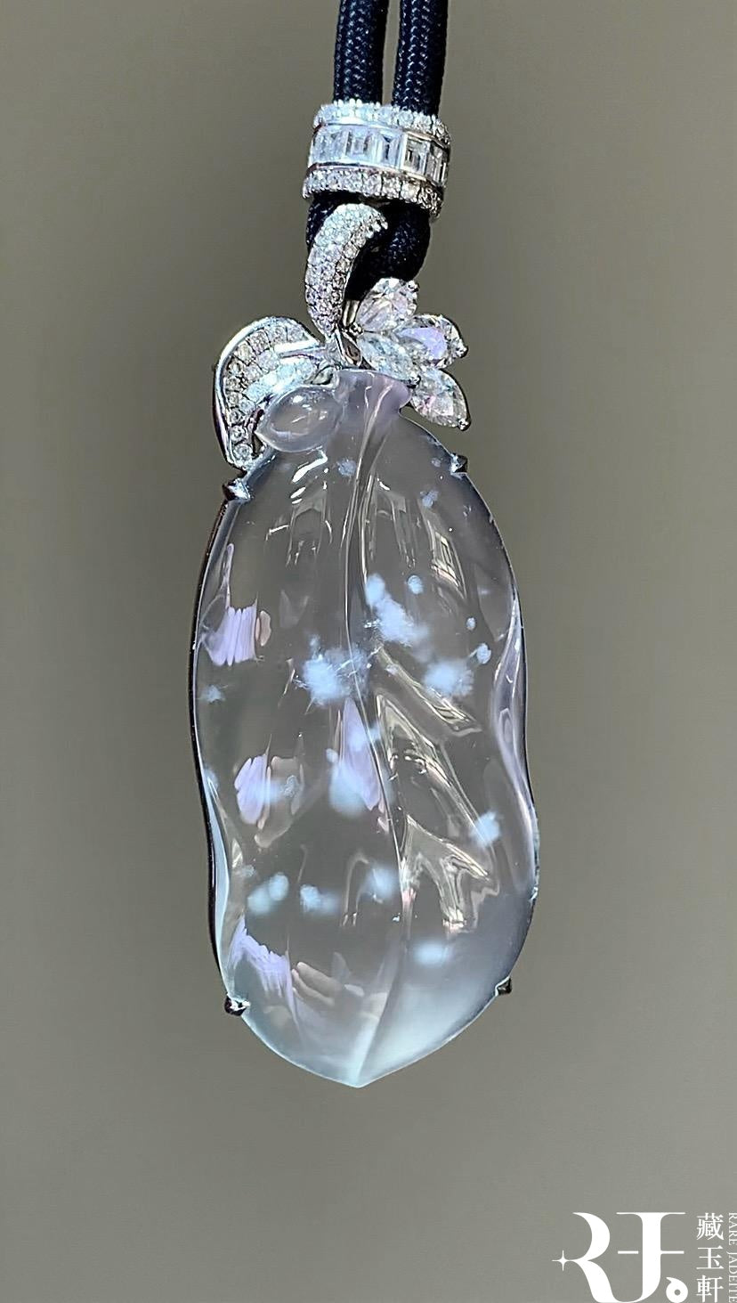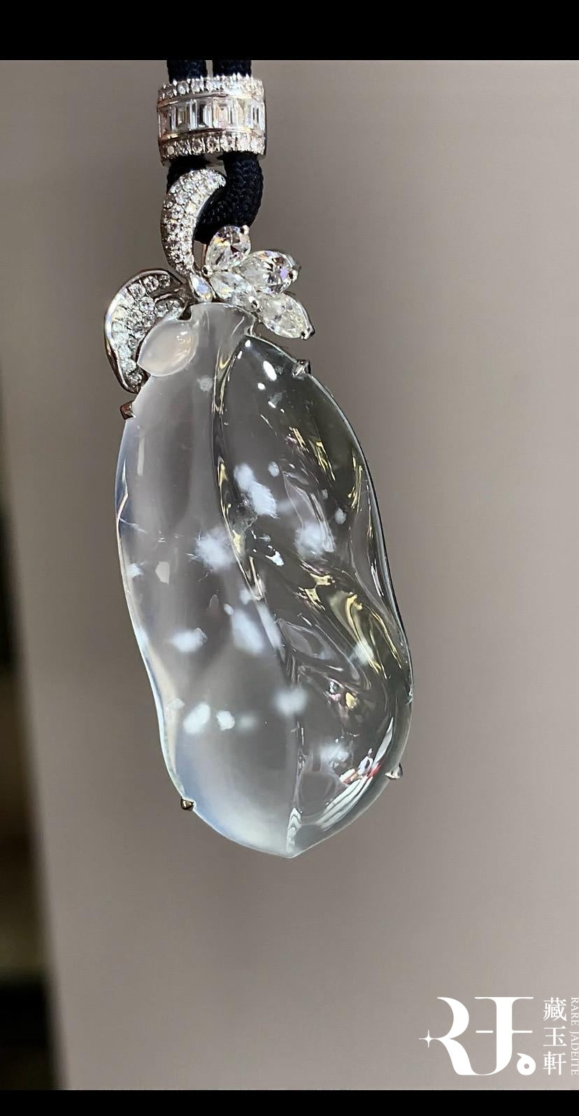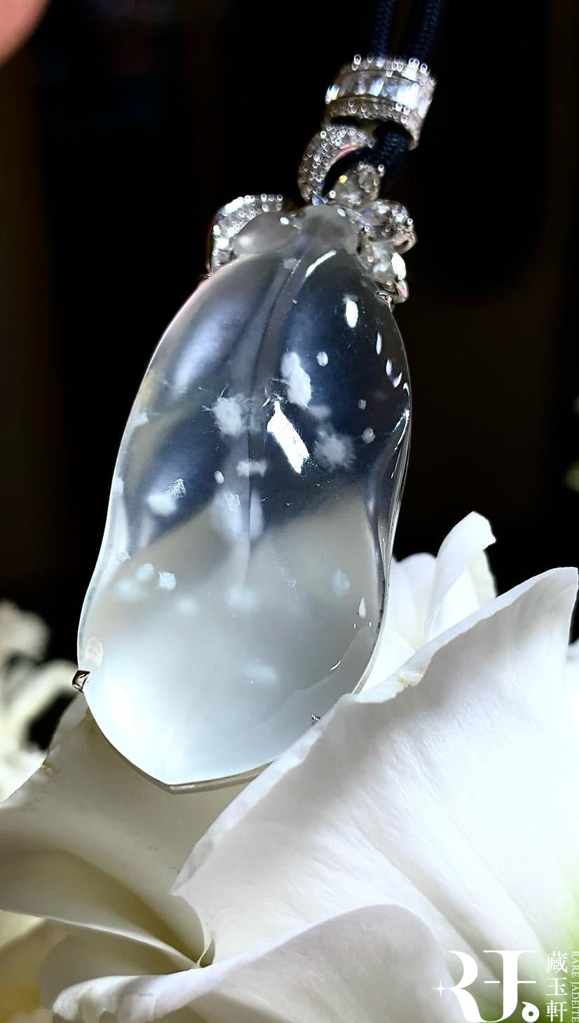 玻璃種木那料雪花棉,整體冰透水潤,玉質圓潤飽滿,膠感十足,雪花棉如冰天雪地般,意境優美。