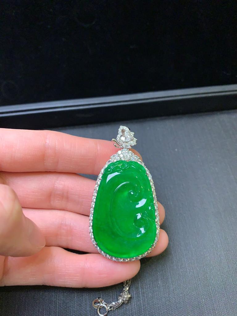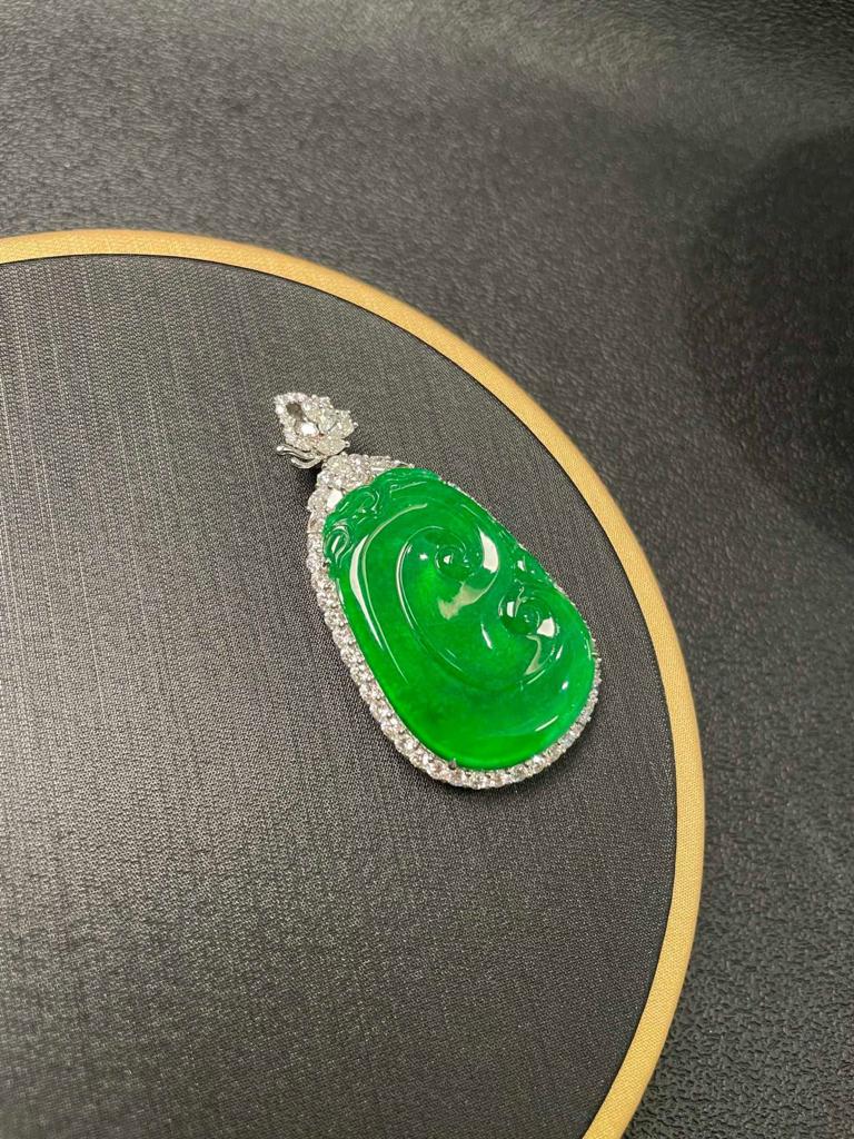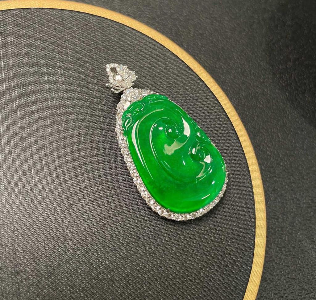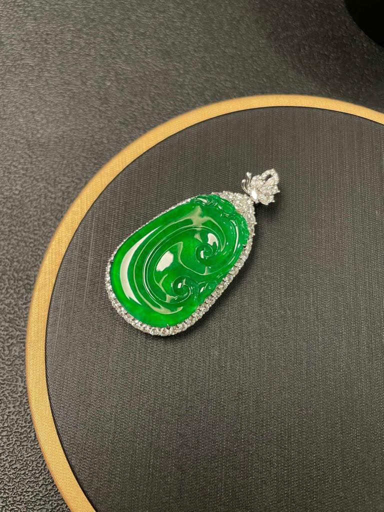 高冰辣陽綠色,玉質飽滿細膩水潤,起螢起光,搭配18K金奢華鑲鑽,上身佩戴起來端莊優雅,雅緻又漂亮。