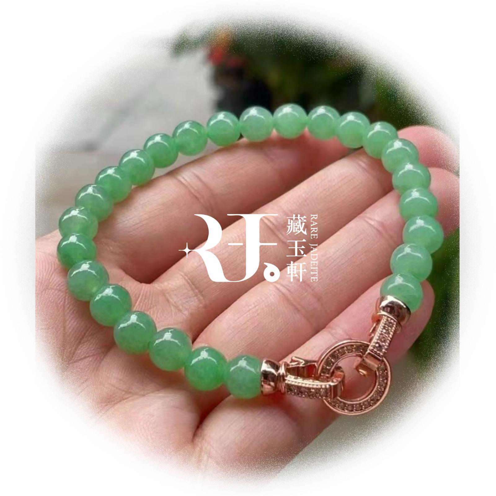 顆顆珠圓玉潤,翠色鮮豔,料底細膩,種水極佳,上手與其他飾品重疊,都不會暗蓋的翠綠。
