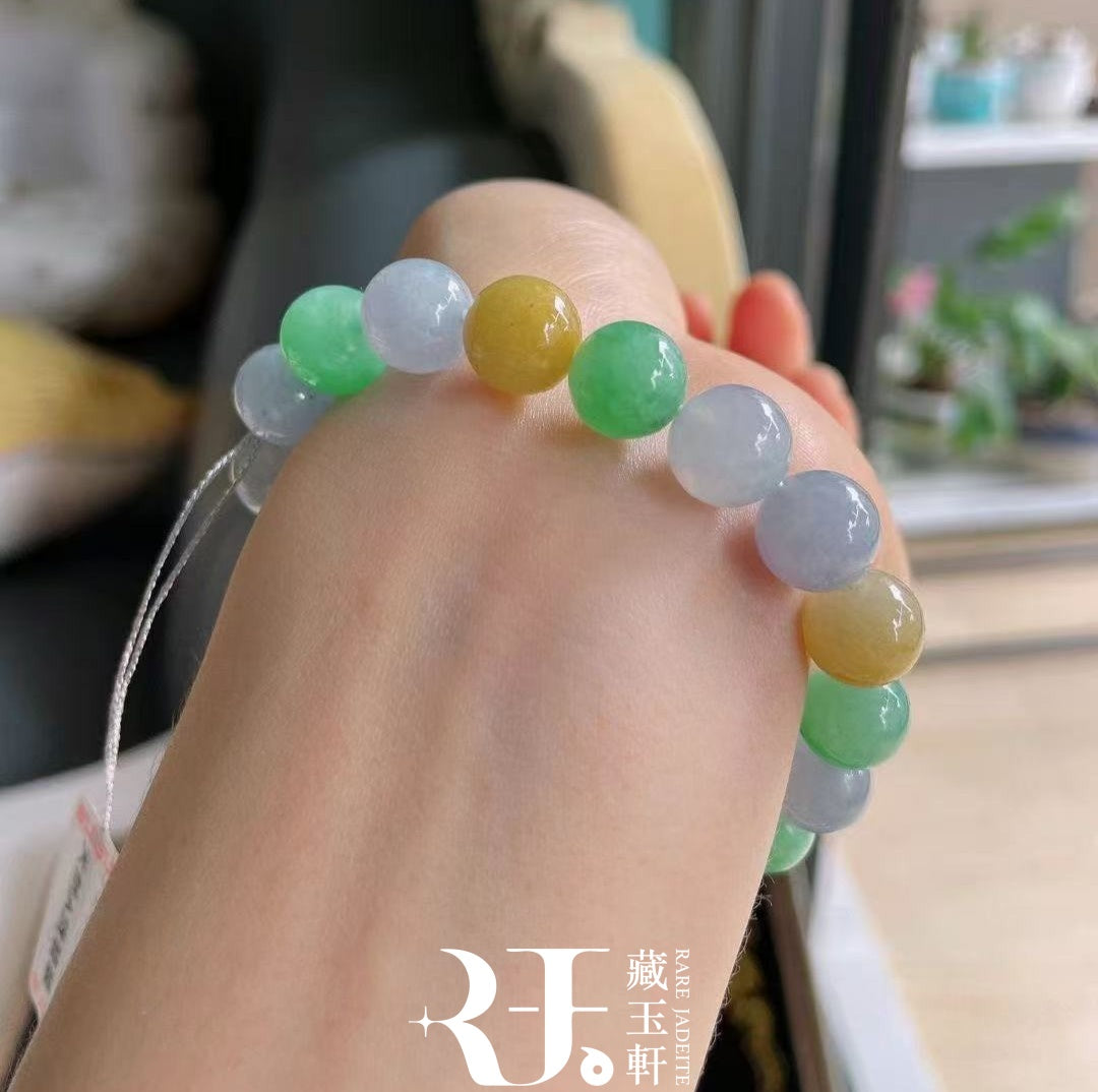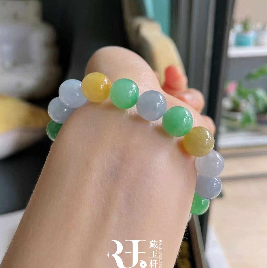 冰種多彩圓珠手串,色彩繽紛,飽和度極好,粒粒圓潤完美。種水好細膩,配戴活潑不老氣。