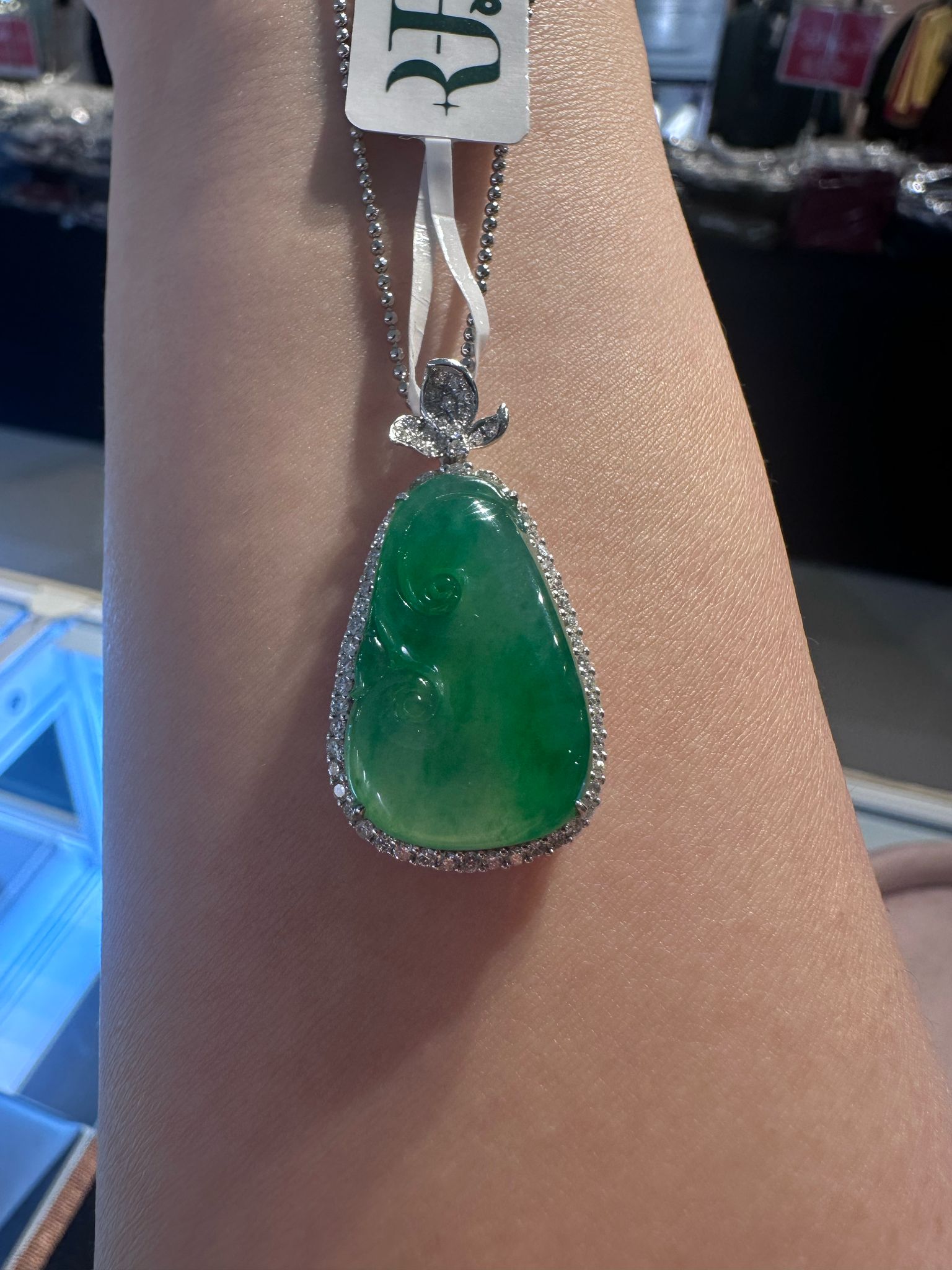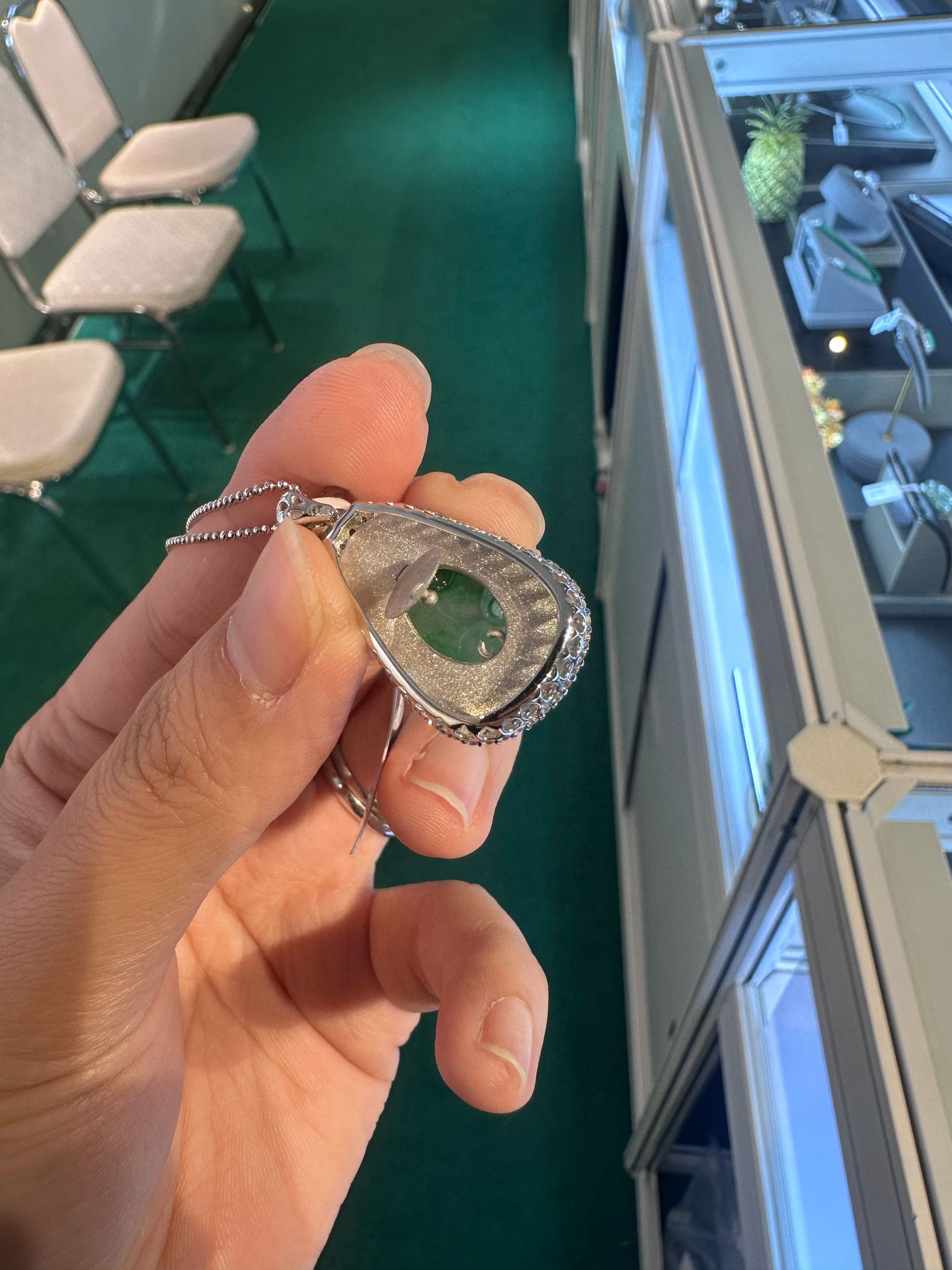 18K金真鑽圍鑲,背後可開窗,看得到種水色,上身佩戴起來端莊優雅,雅緻又漂亮。