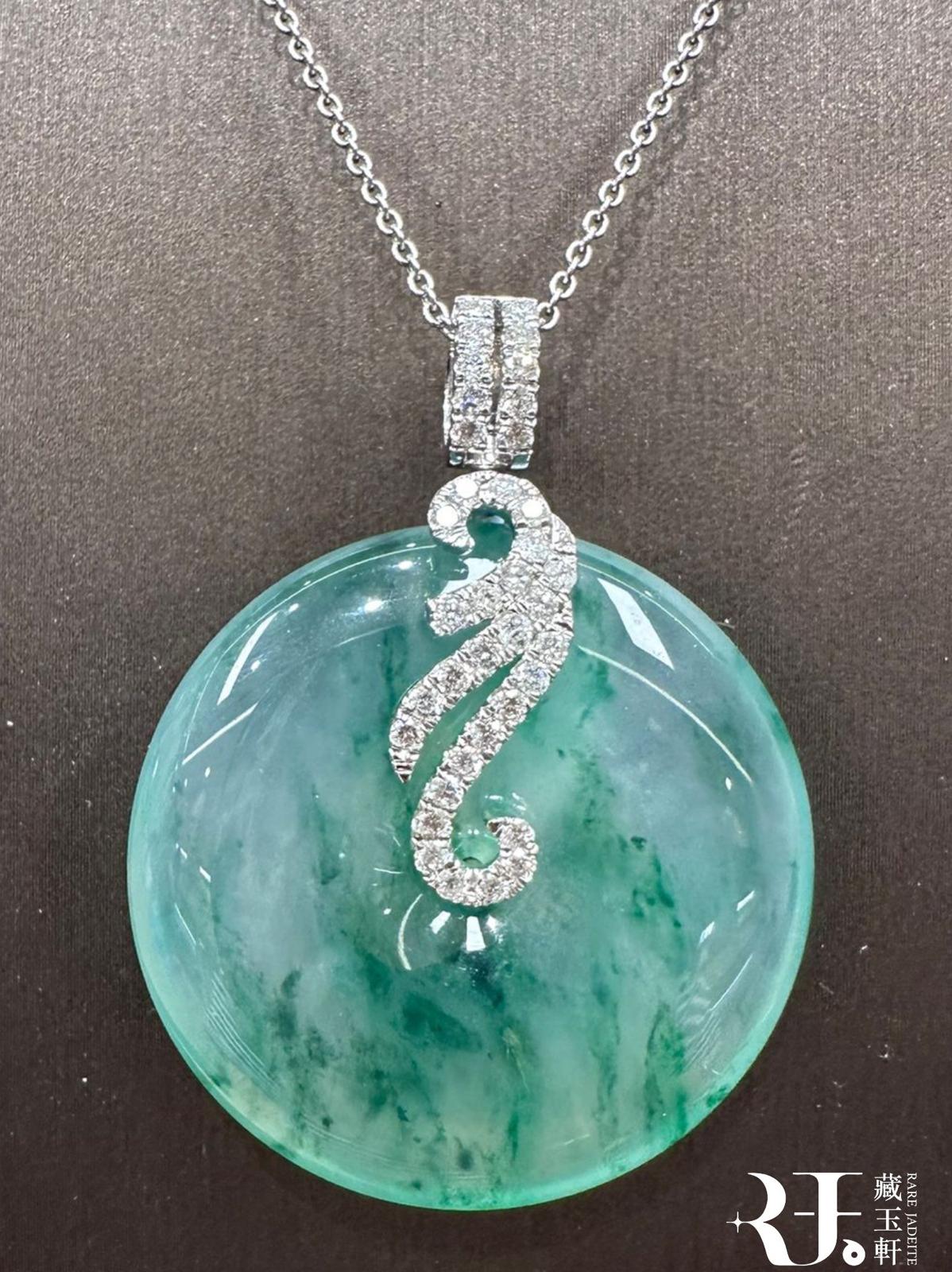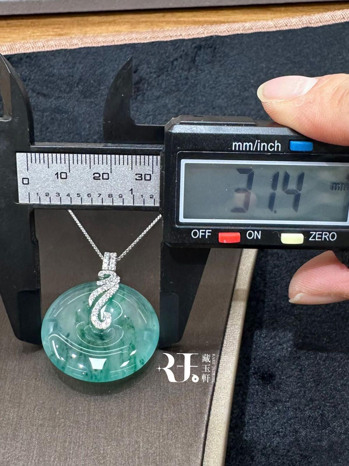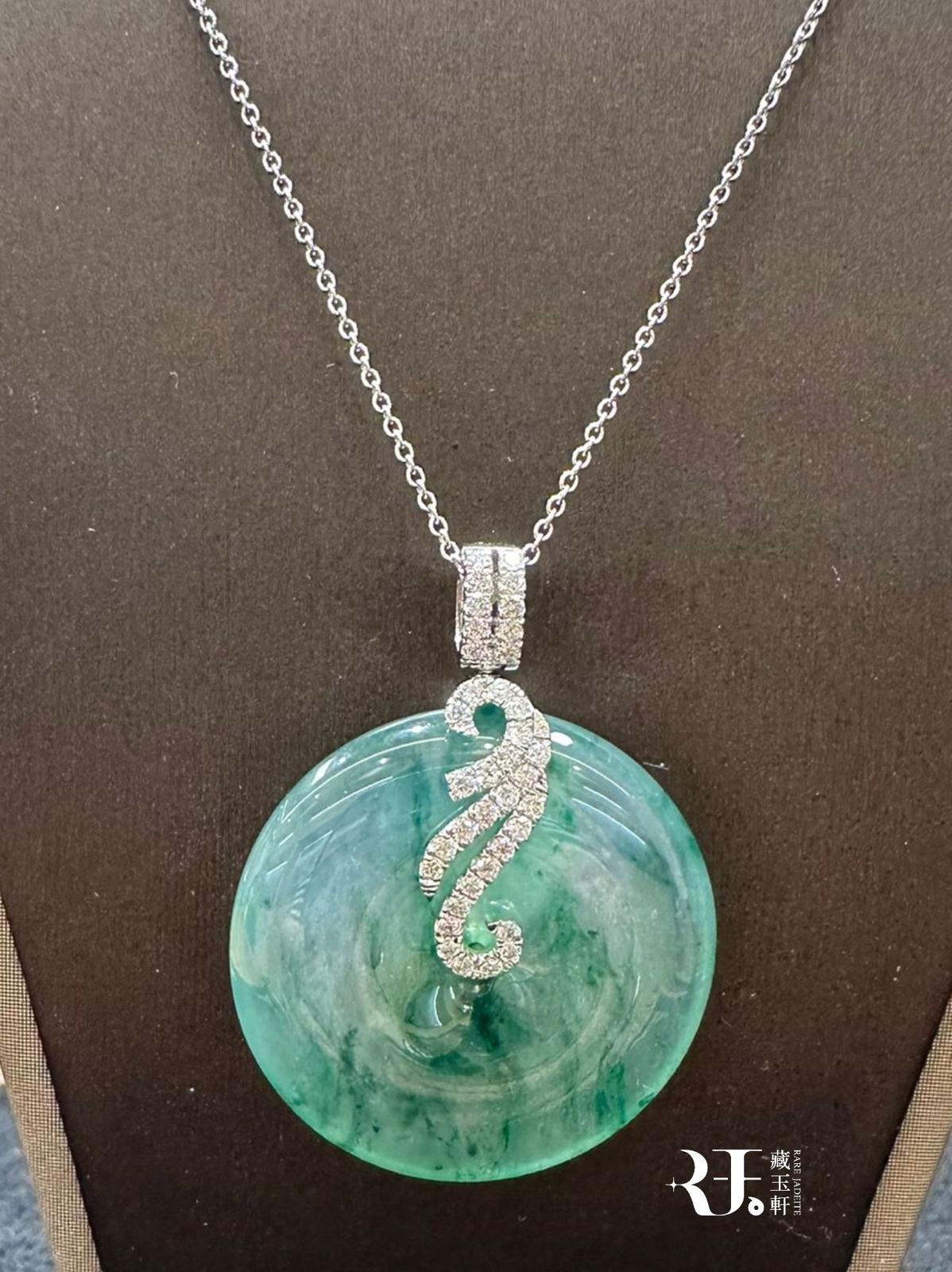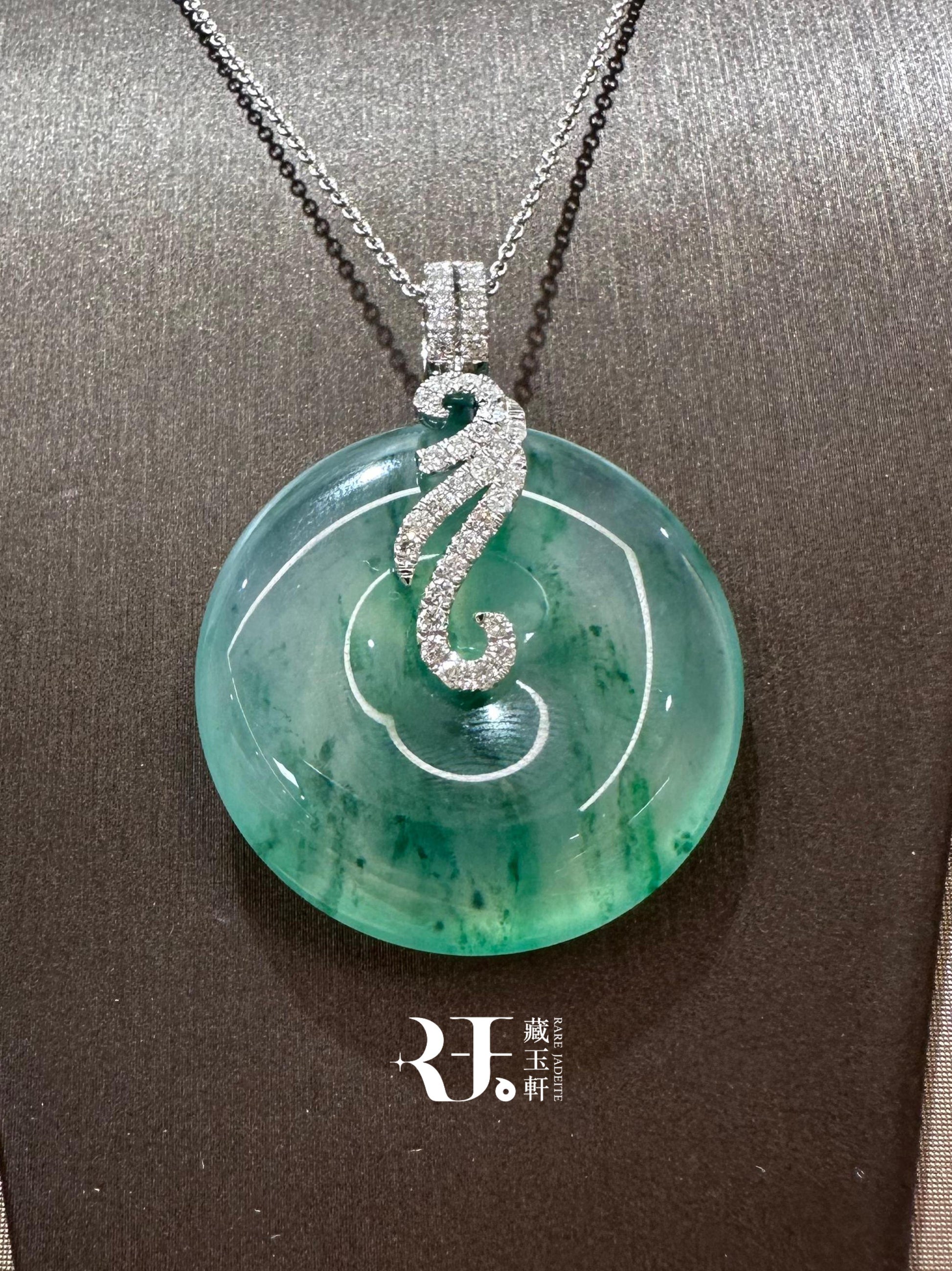 此款平安扣,採取 18K 金及VS1 鑽石真金真鑽鑲嵌。整體高冰玻璃底,在 完美綠晴底種水襯托飄陽綠飄花,猶如如撫仙湖底中沈靜優雅,碧波盪漾, 惟妙惟肖! 也可想綠光森林中一道光照到深山裡得湖面水草中飄花靈動,濃 郁的飄花每一朵每一株都相當的立體漂亮,畫面感太強