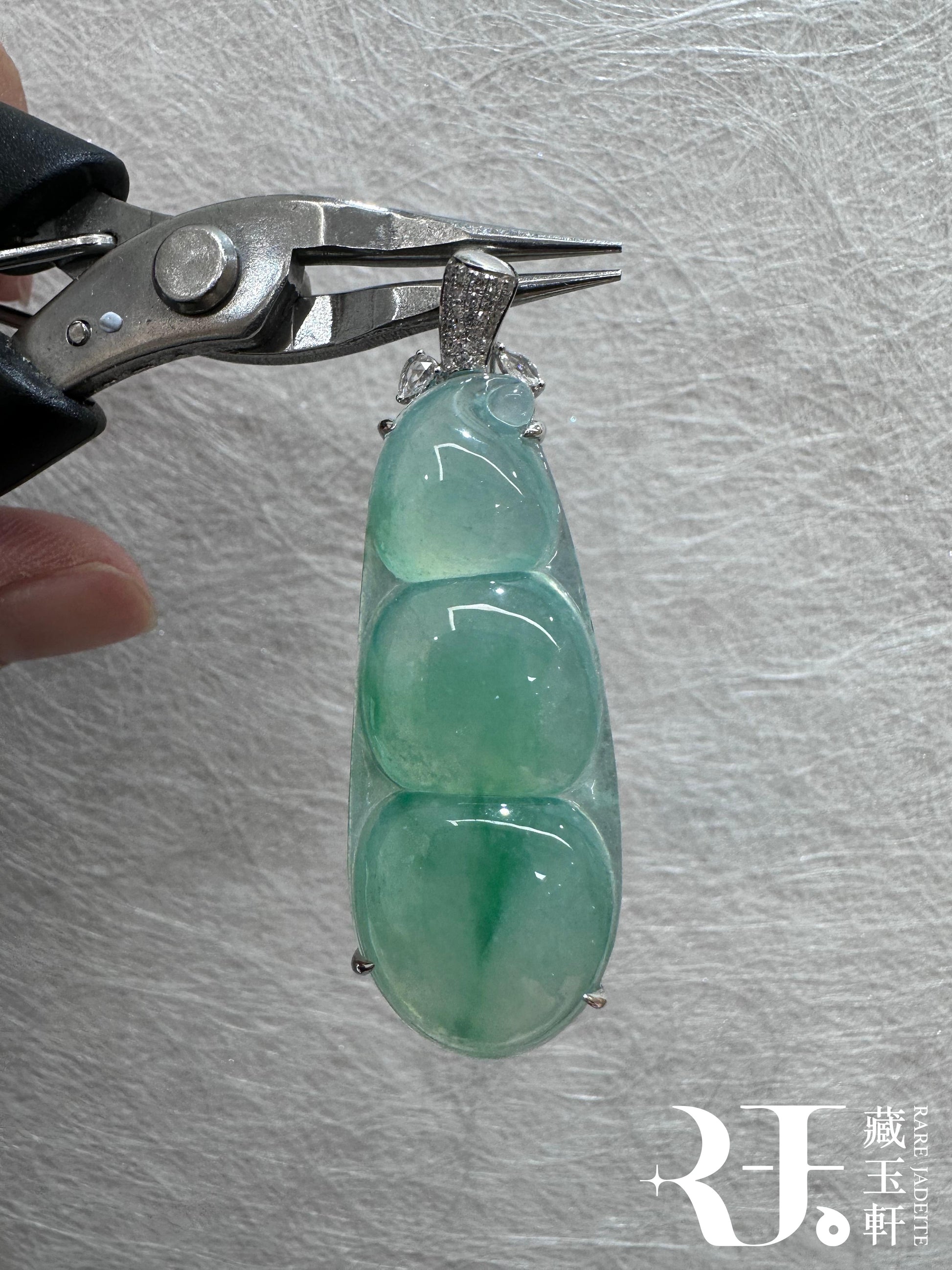 玉質種老細膩起螢起膠,裸石青翠明豔,玉質圓潤飽滿。