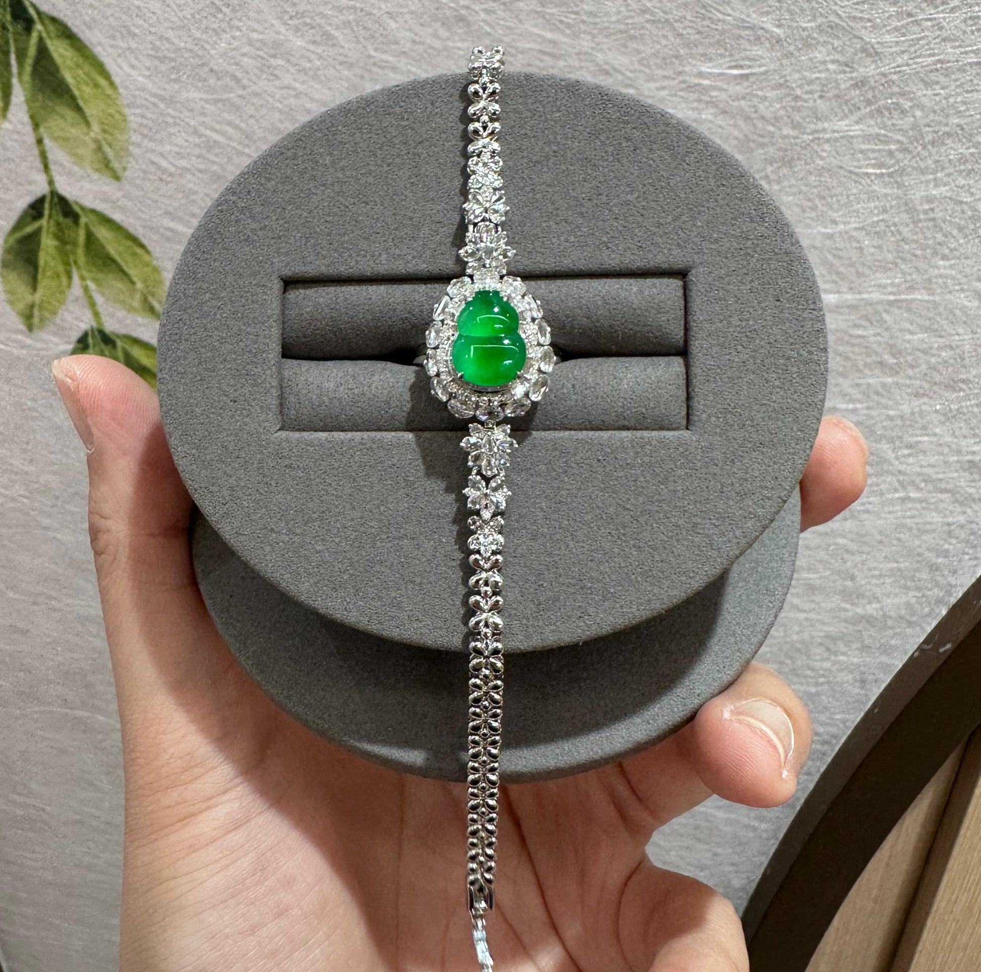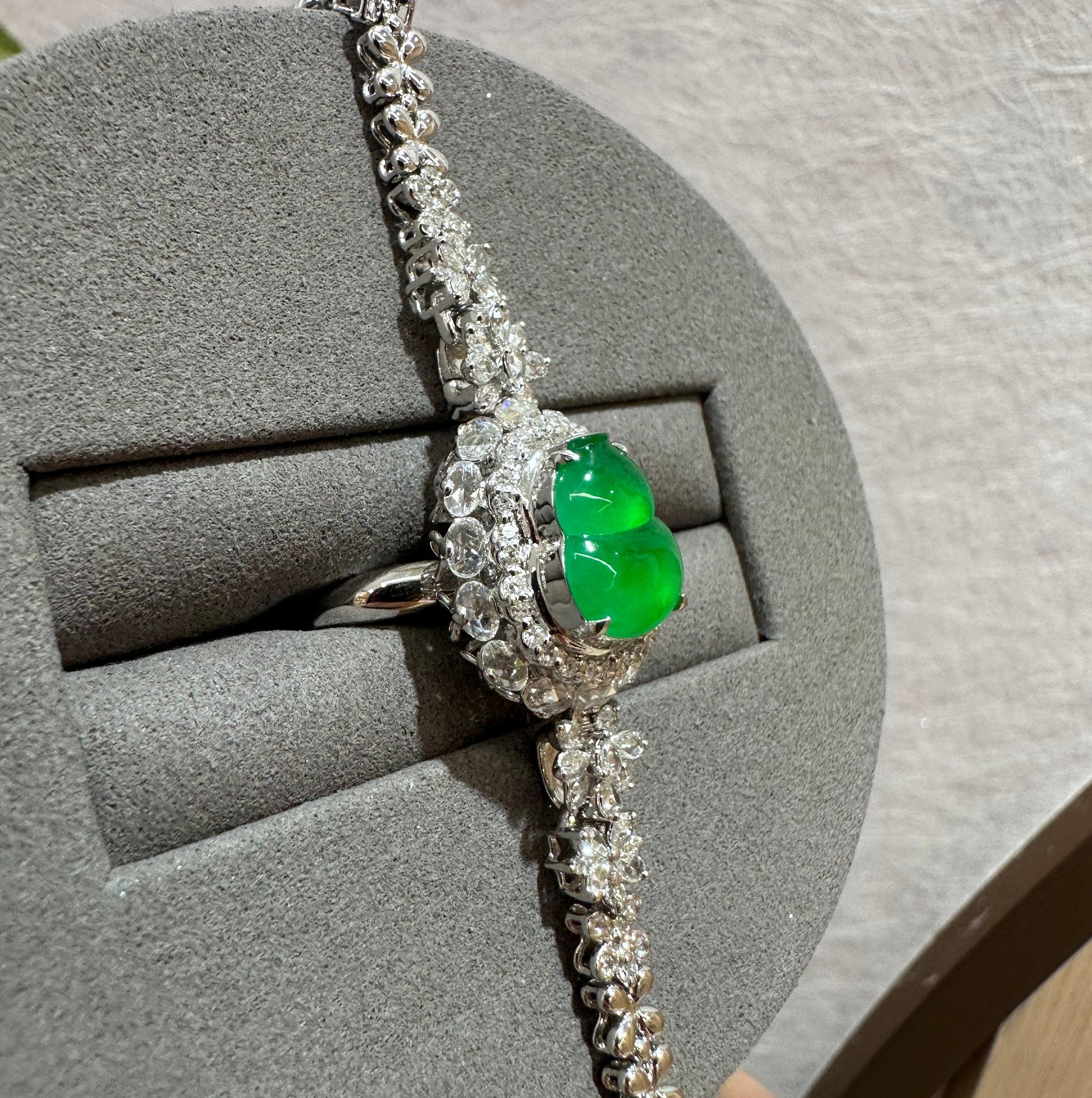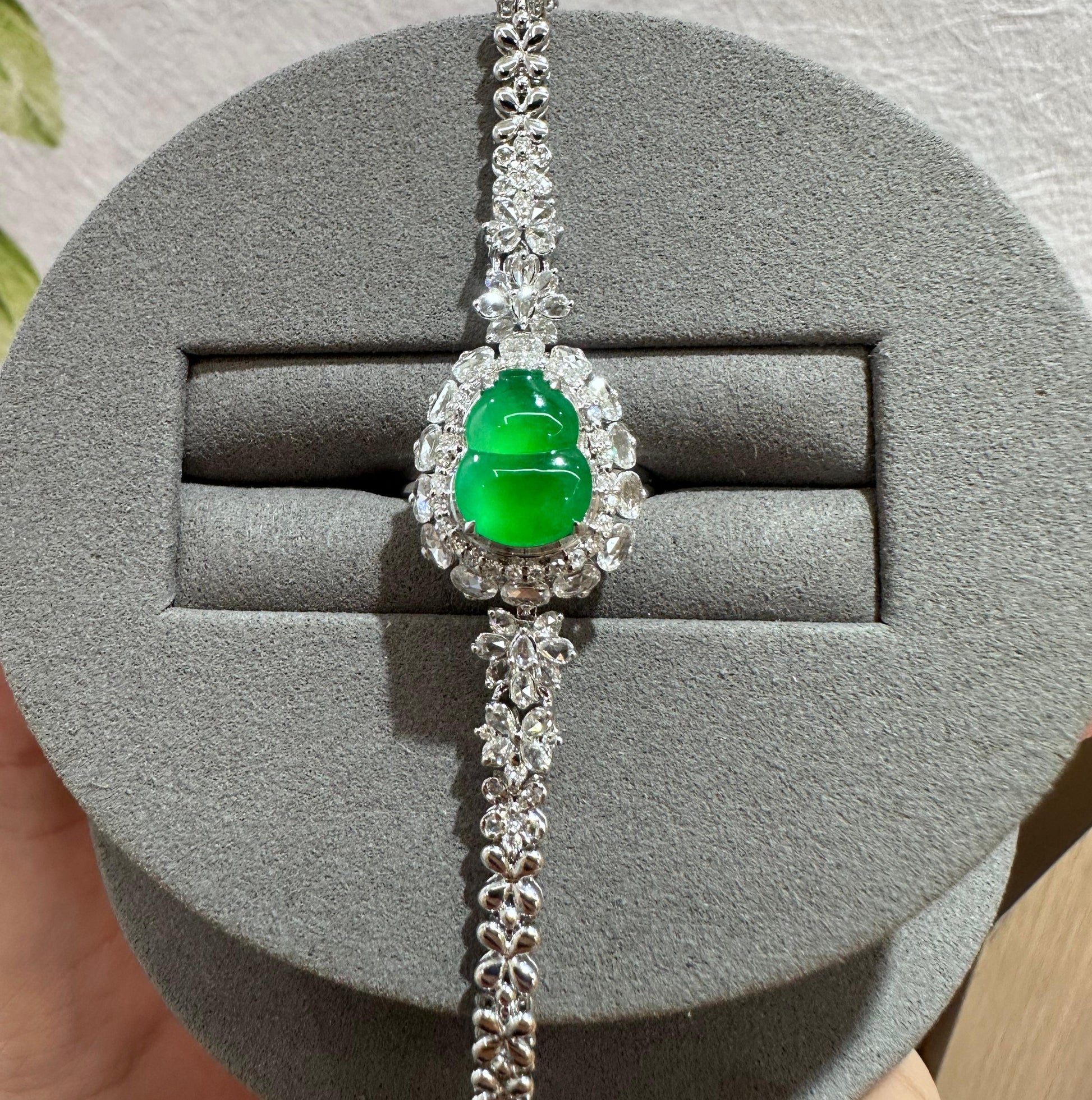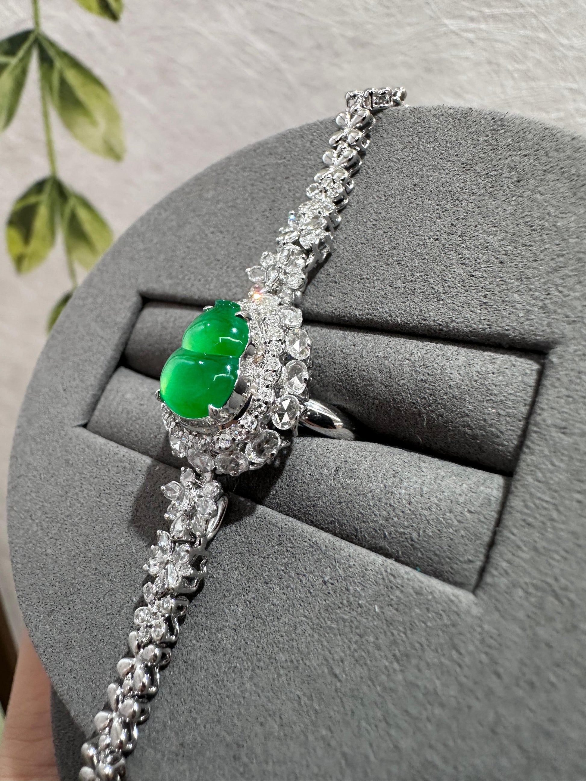 冰種甜果綠,翠綠欲滴,色澤鮮豔濃郁,葫型圓潤飽滿。