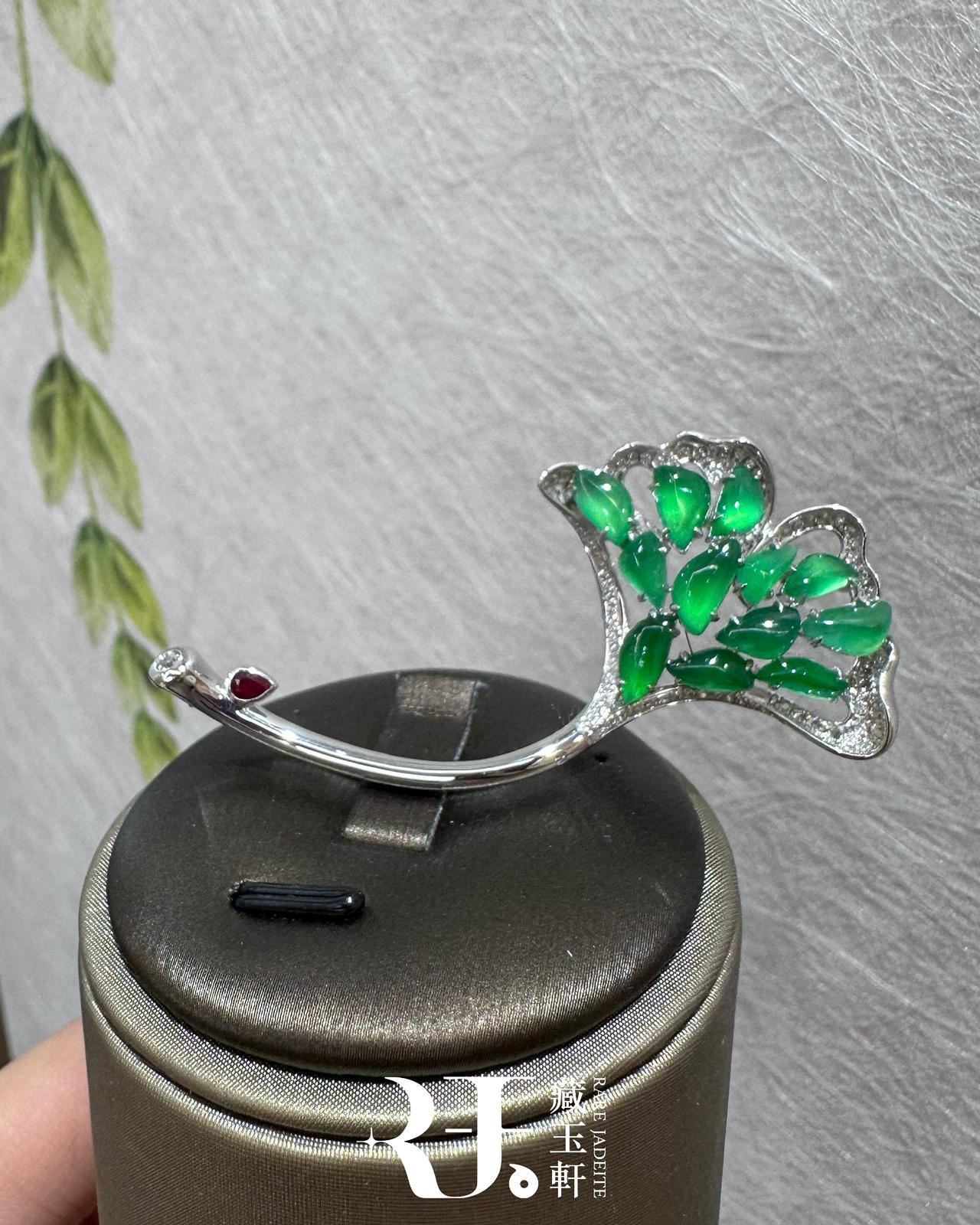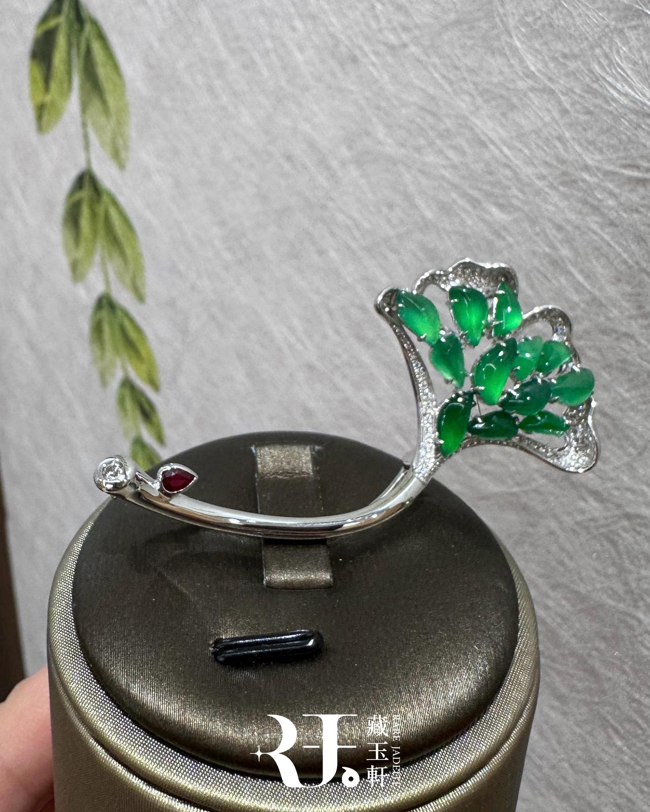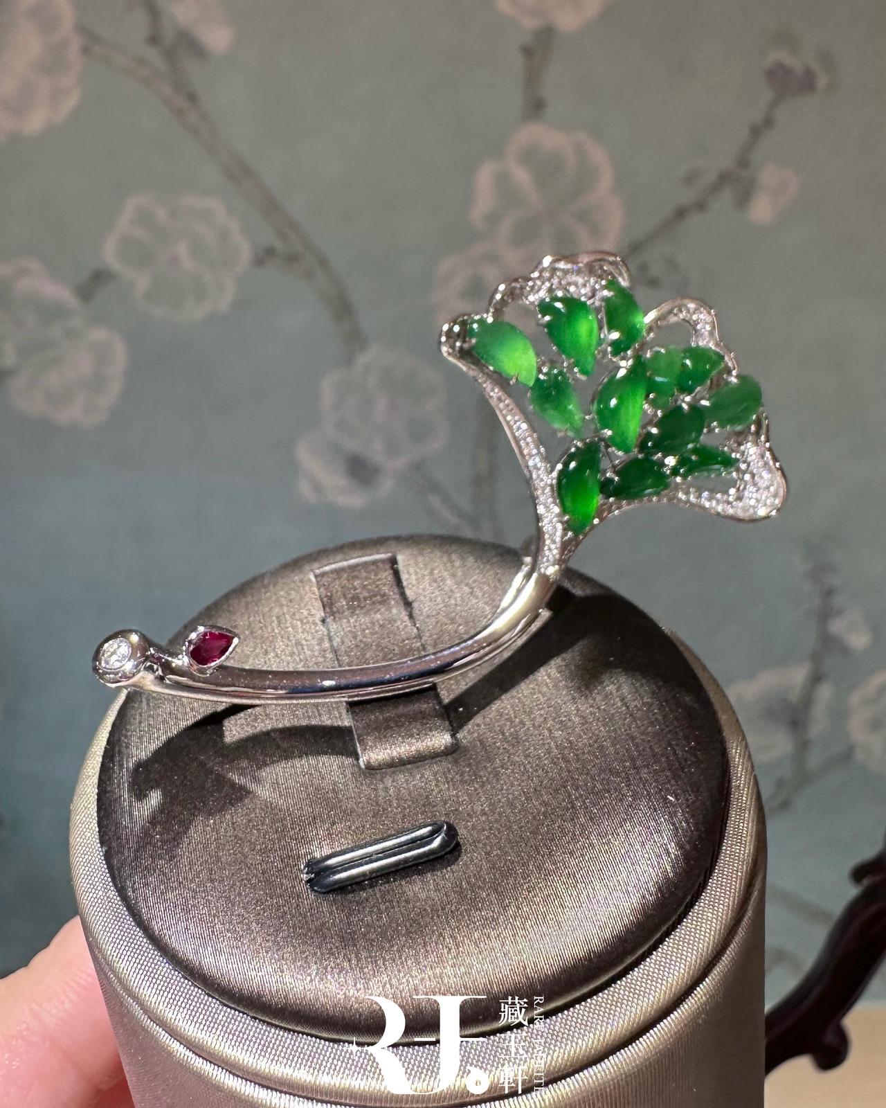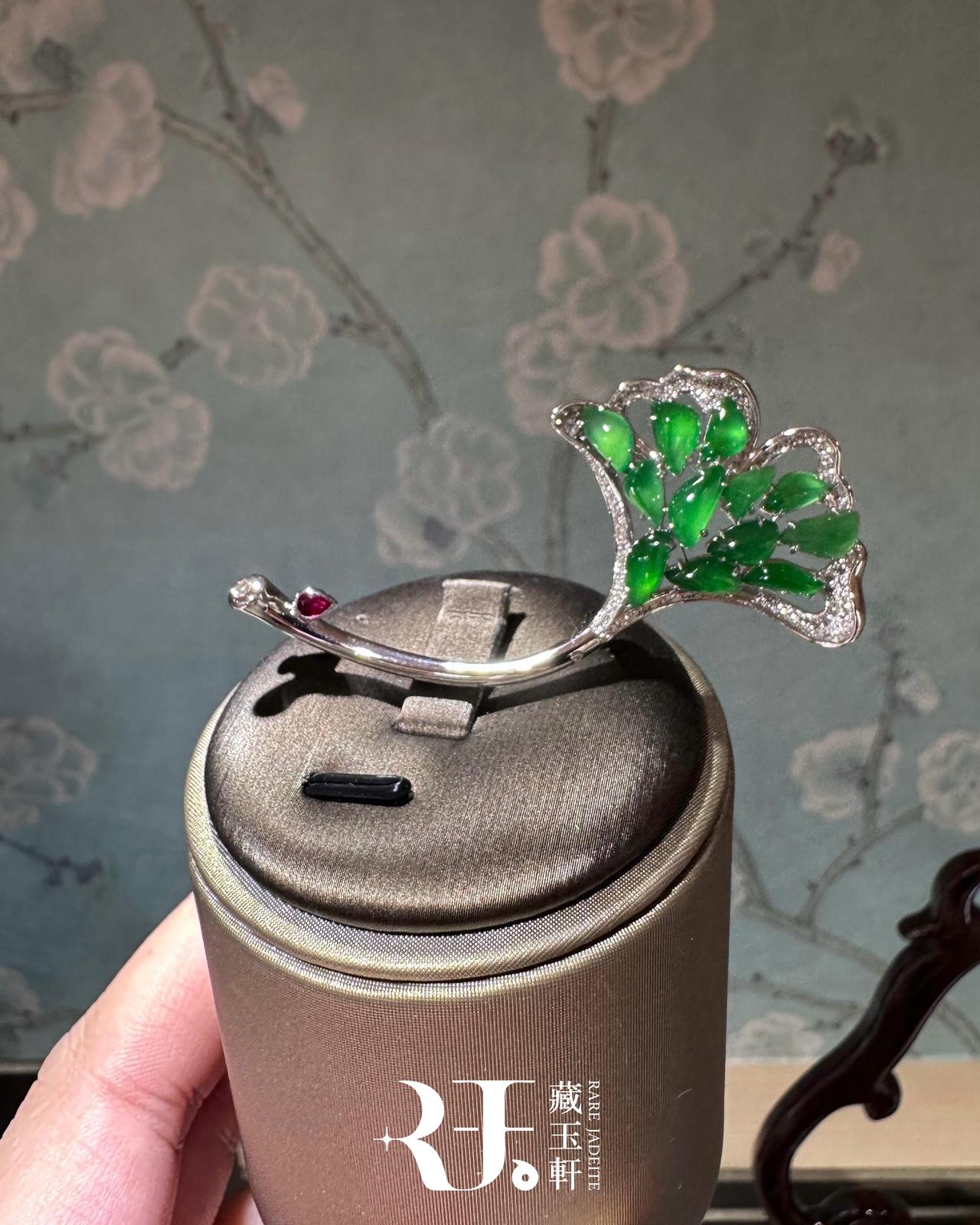 裸石採用12顆隨形冰種綠翡鑲嵌在杏葉葉面上,葉形呈現愛心,葉梗尾端用紅寶點綴,寓意永恆堅定。