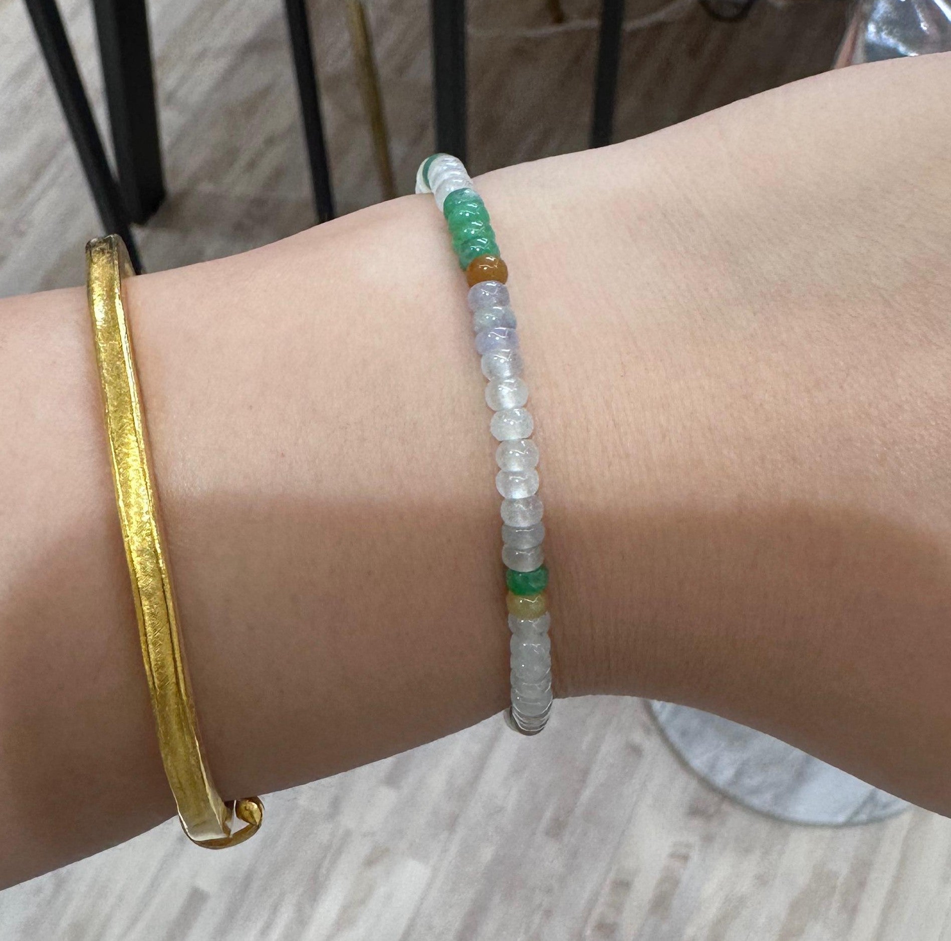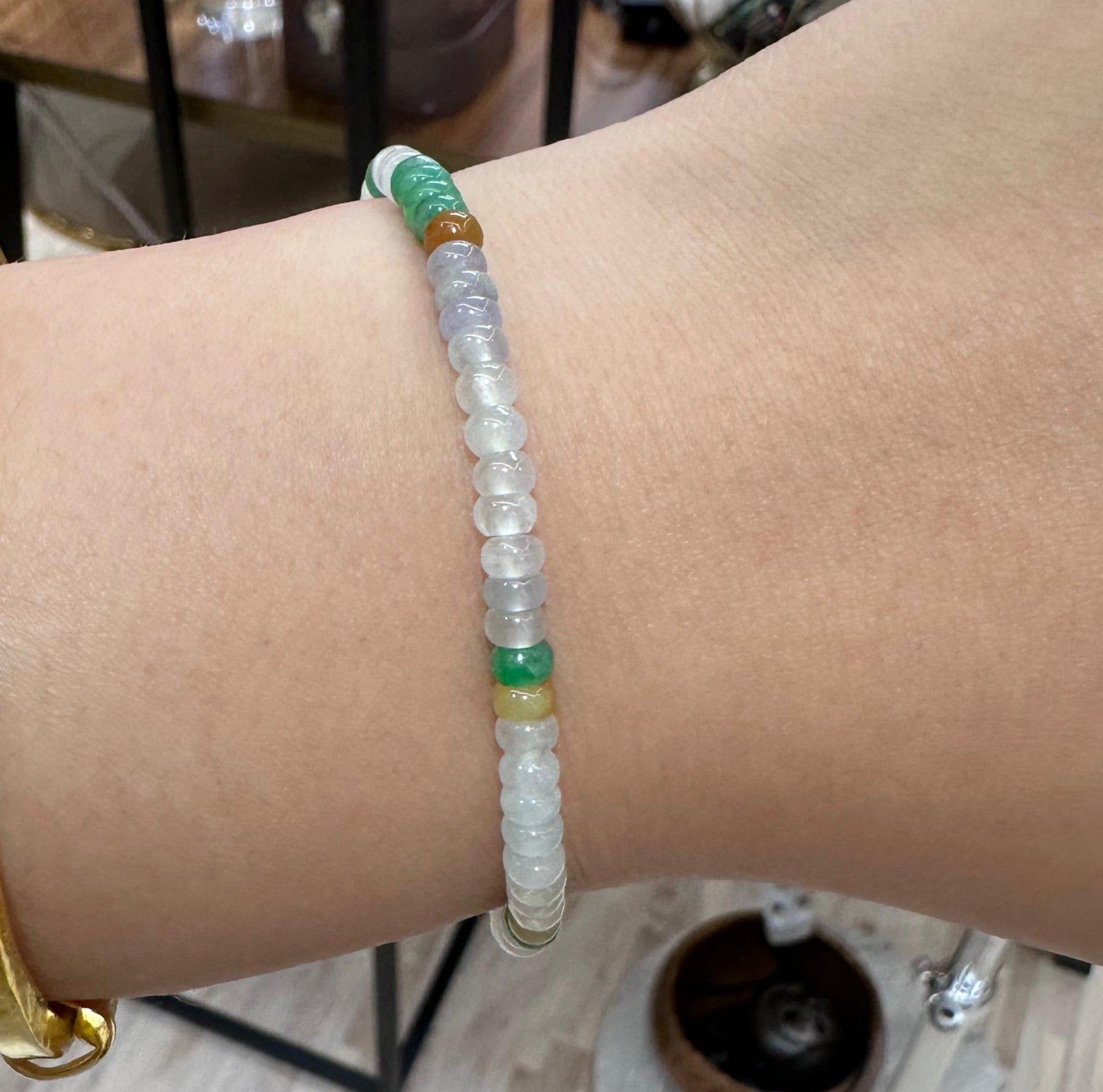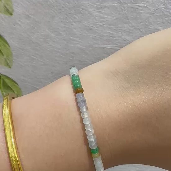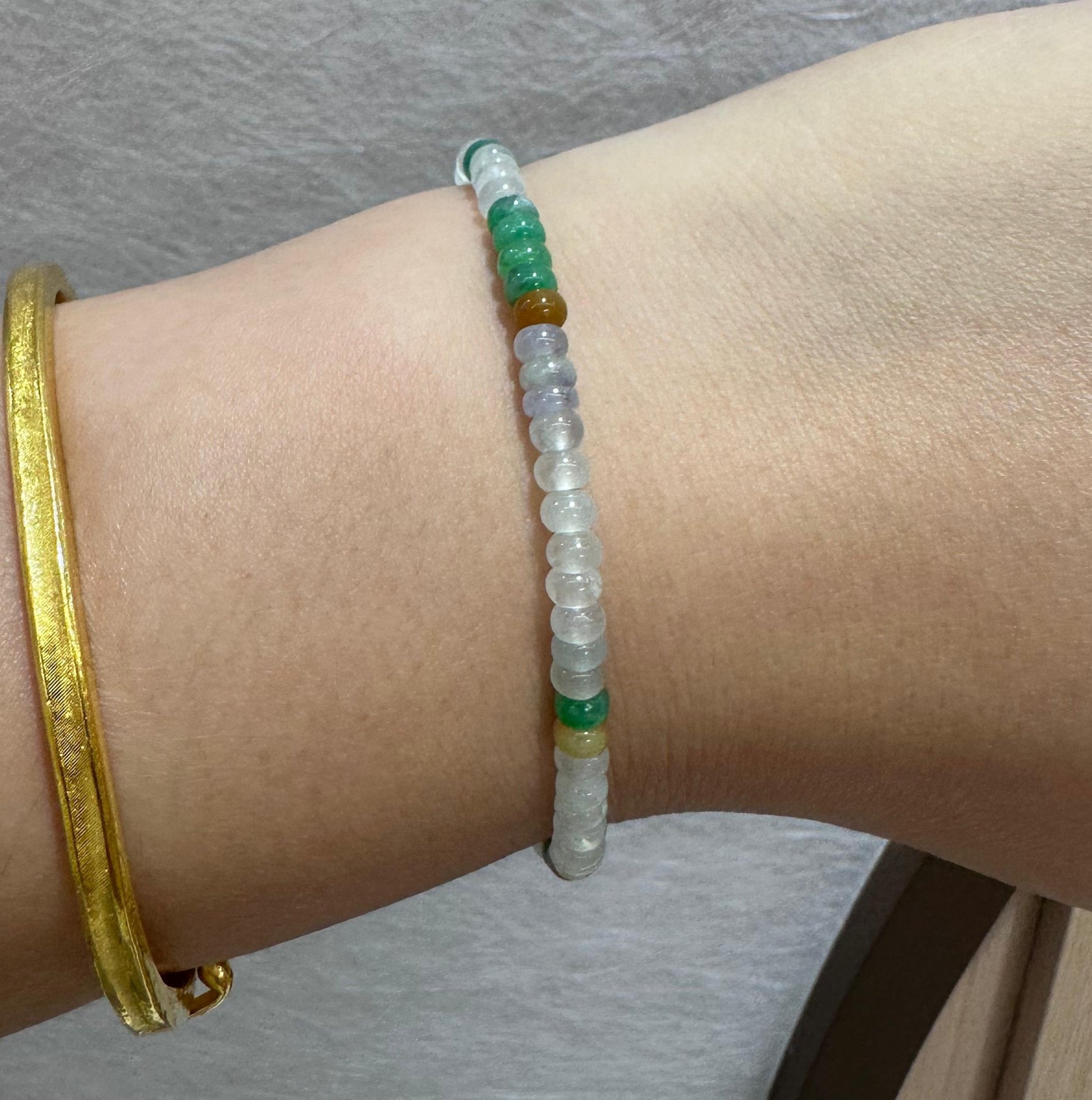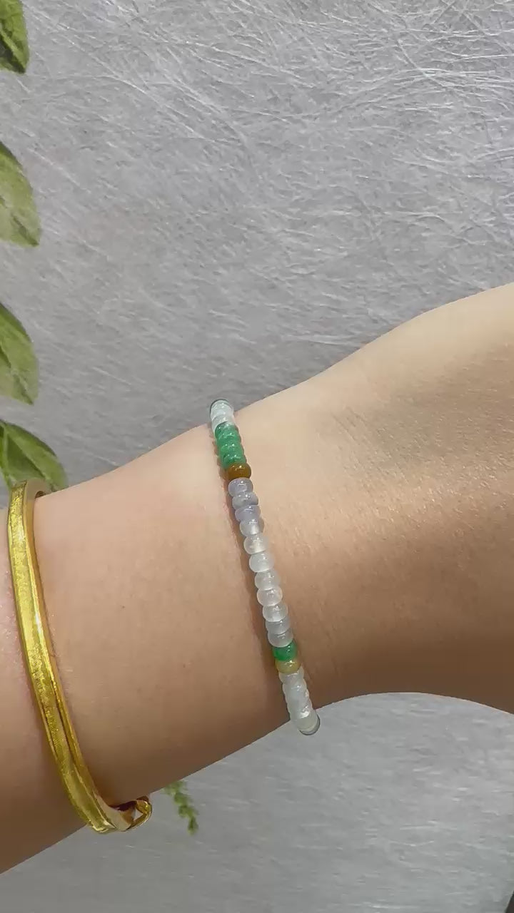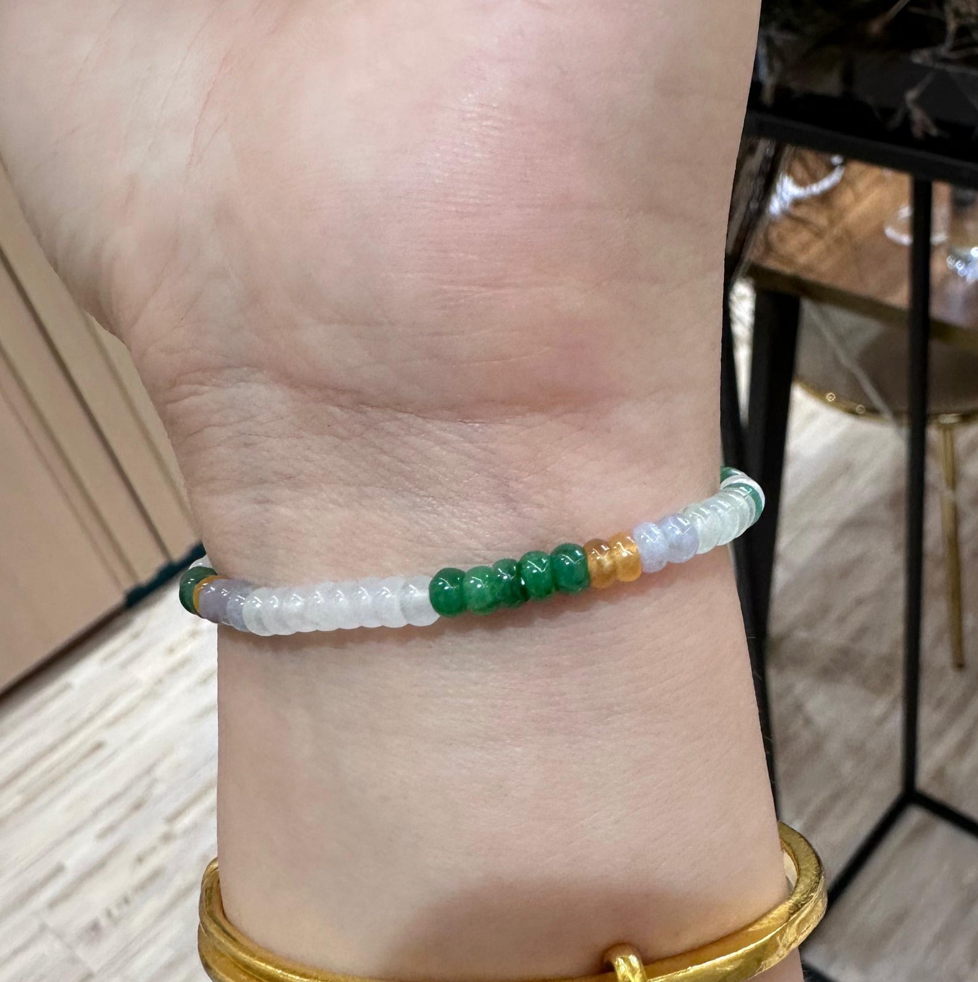 冰種三彩算盤珠手串,色澤豐富鮮豔明亮,玉質細膩水潤。