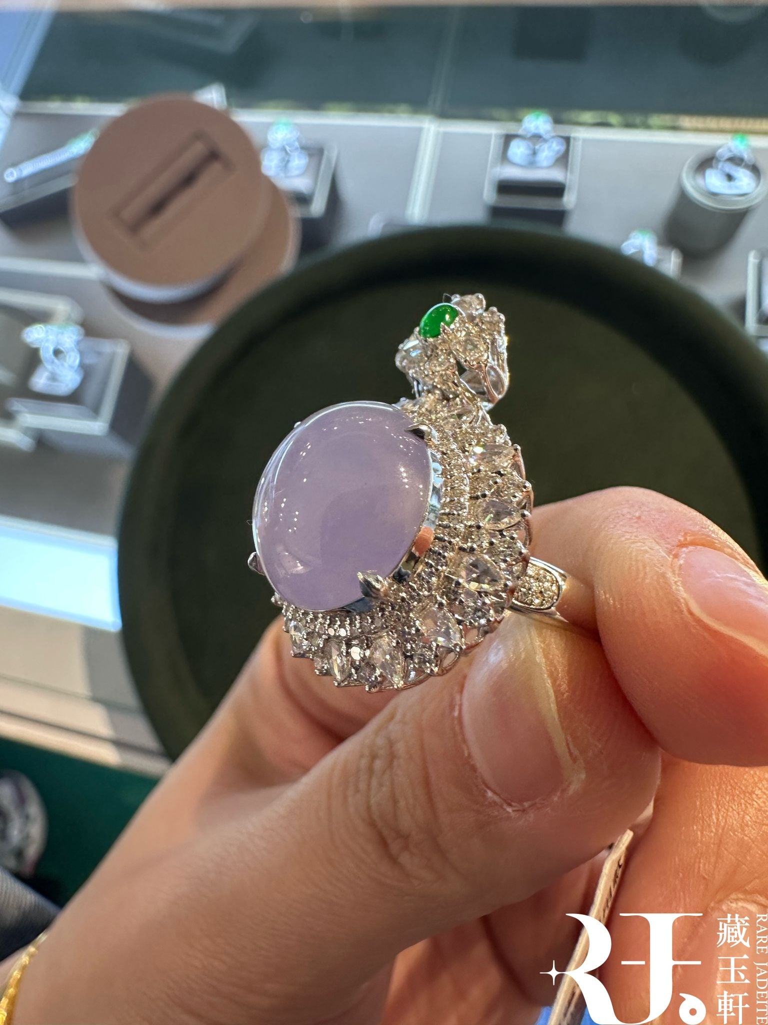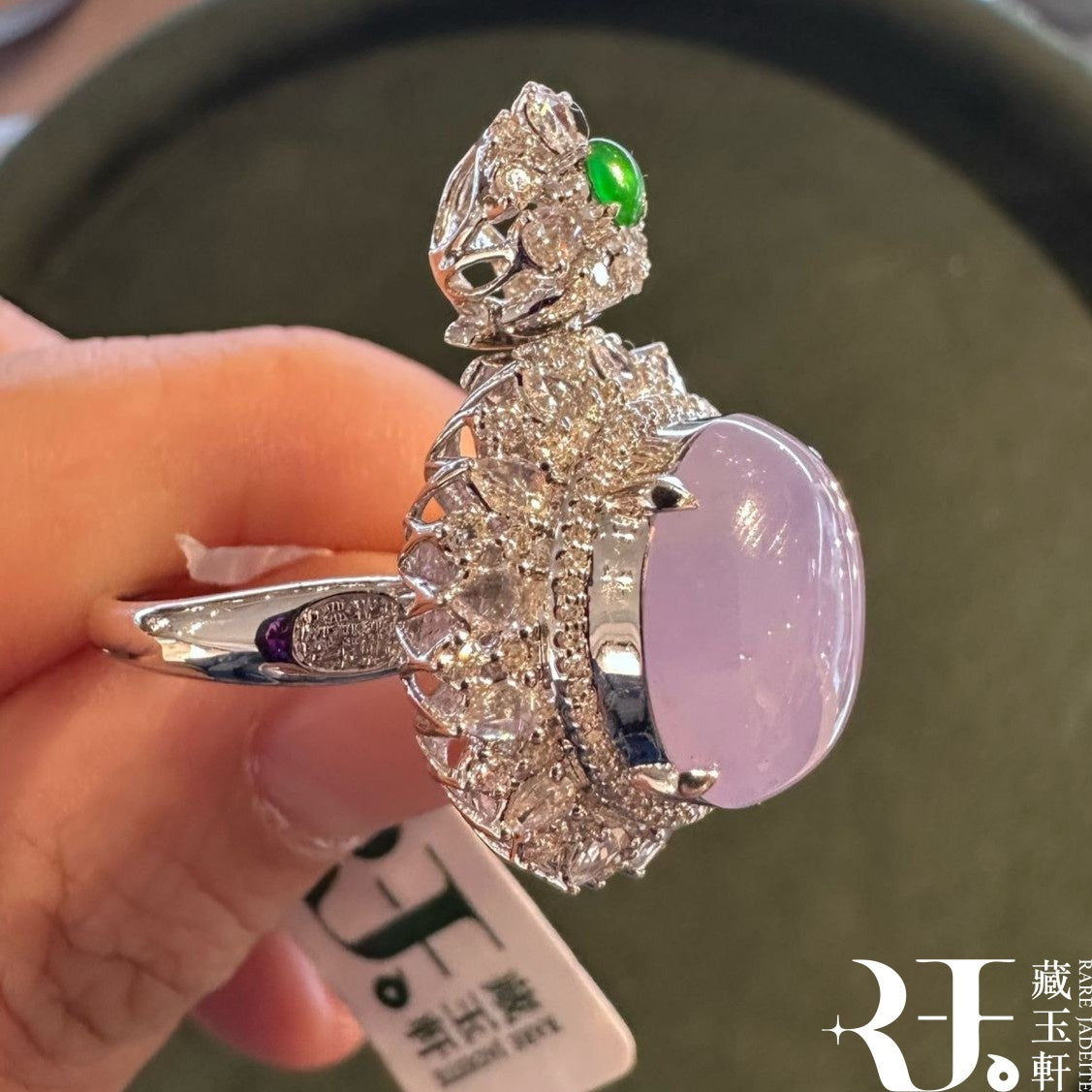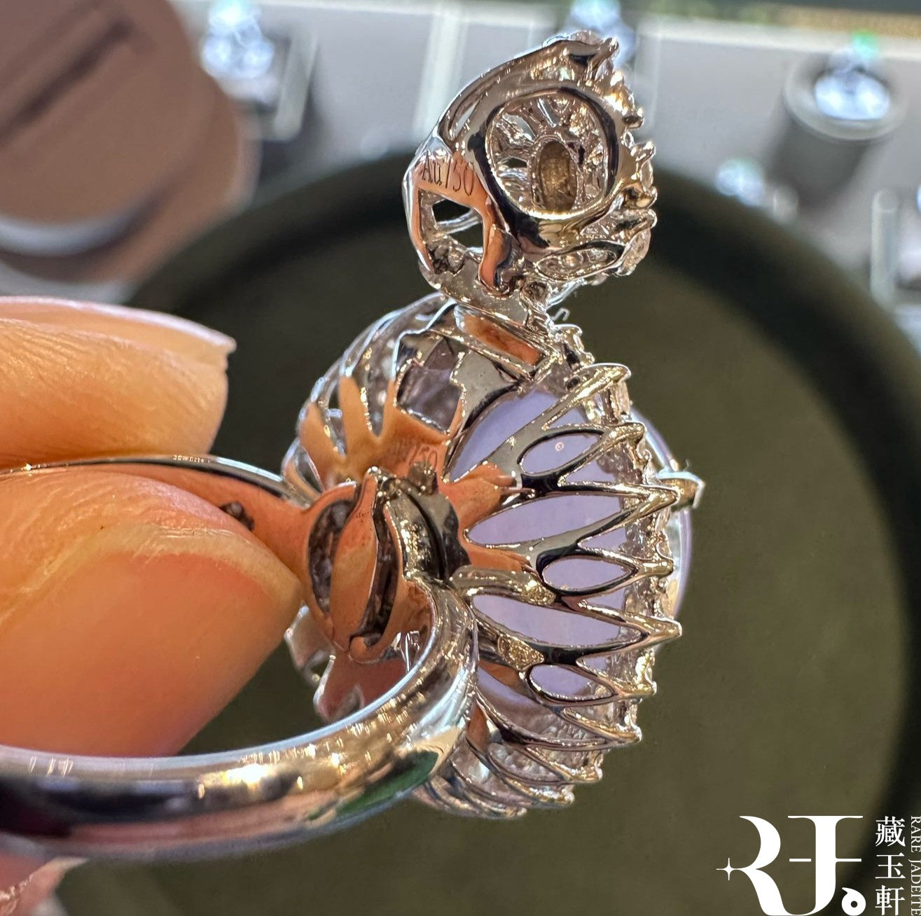 而這款紫翡冰紫羅蘭蛋面兩用款 18K金真金真鑽鑲嵌,吊頭是機關可內折藏 於戒底花型蜂巢內,而我們紫蛋面採無封底鑲嵌,在蜂巢內可看到紫翡蛋面 的種水色,普遍市面翡翠通貨都會將紫翡蛋面鑲嵌封底,可能內藏粉紅墊片 提升紫翡的色而高價售出,而我們藏玉軒的紫翡蛋面完美而敢於底部蜂巢鑲 嵌無封底,無庸置疑是自信表現!