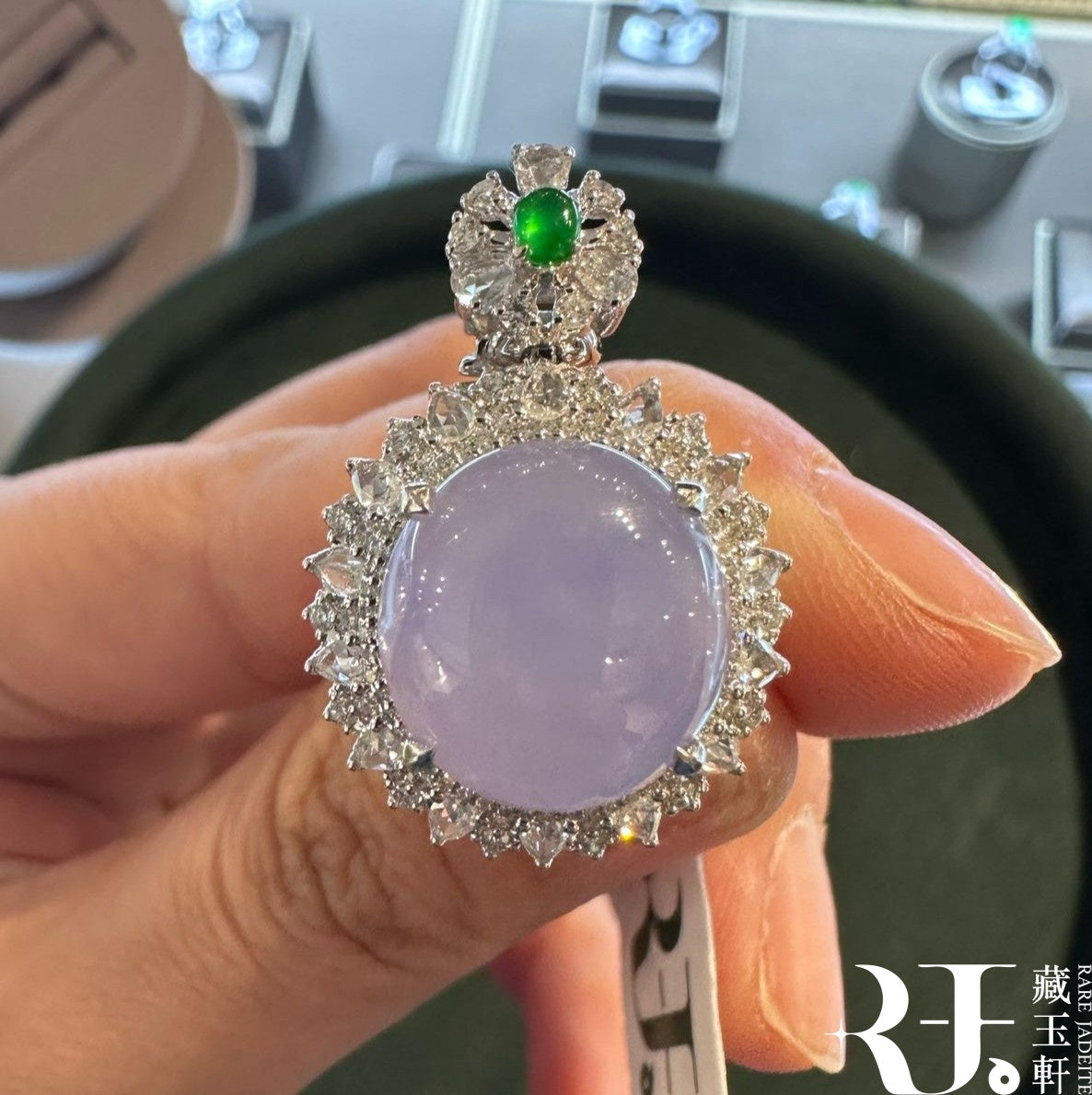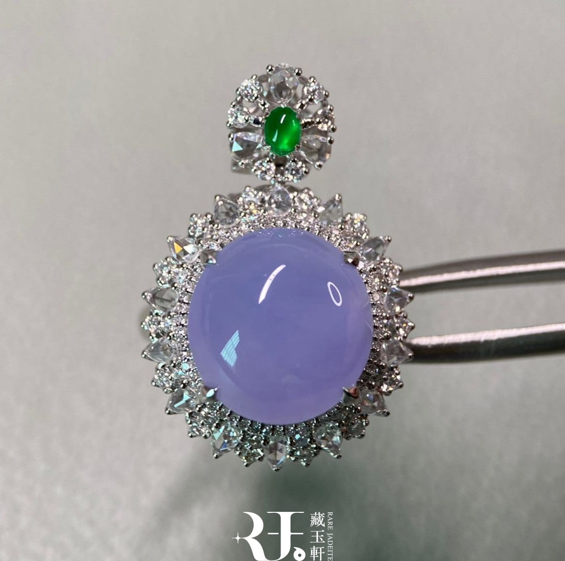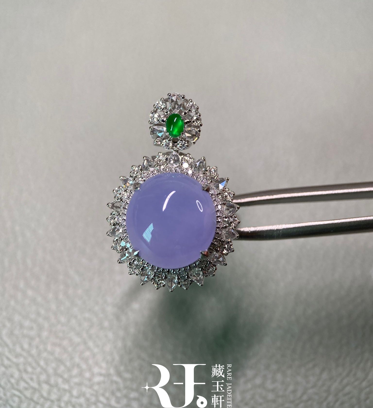 而這款紫翡冰紫羅蘭蛋面兩用款 18K金真金真鑽鑲嵌,吊頭是機關可內折藏 於戒底花型蜂巢內,而我們紫蛋面採無封底鑲嵌,在蜂巢內可看到紫翡蛋面 的種水色,普遍市面翡翠通貨都會將紫翡蛋面鑲嵌封底,可能內藏粉紅墊片 提升紫翡的色而高價售出,而我們藏玉軒的紫翡蛋面完美而敢於底部蜂巢鑲 嵌無封底,無庸置疑是自信表現!