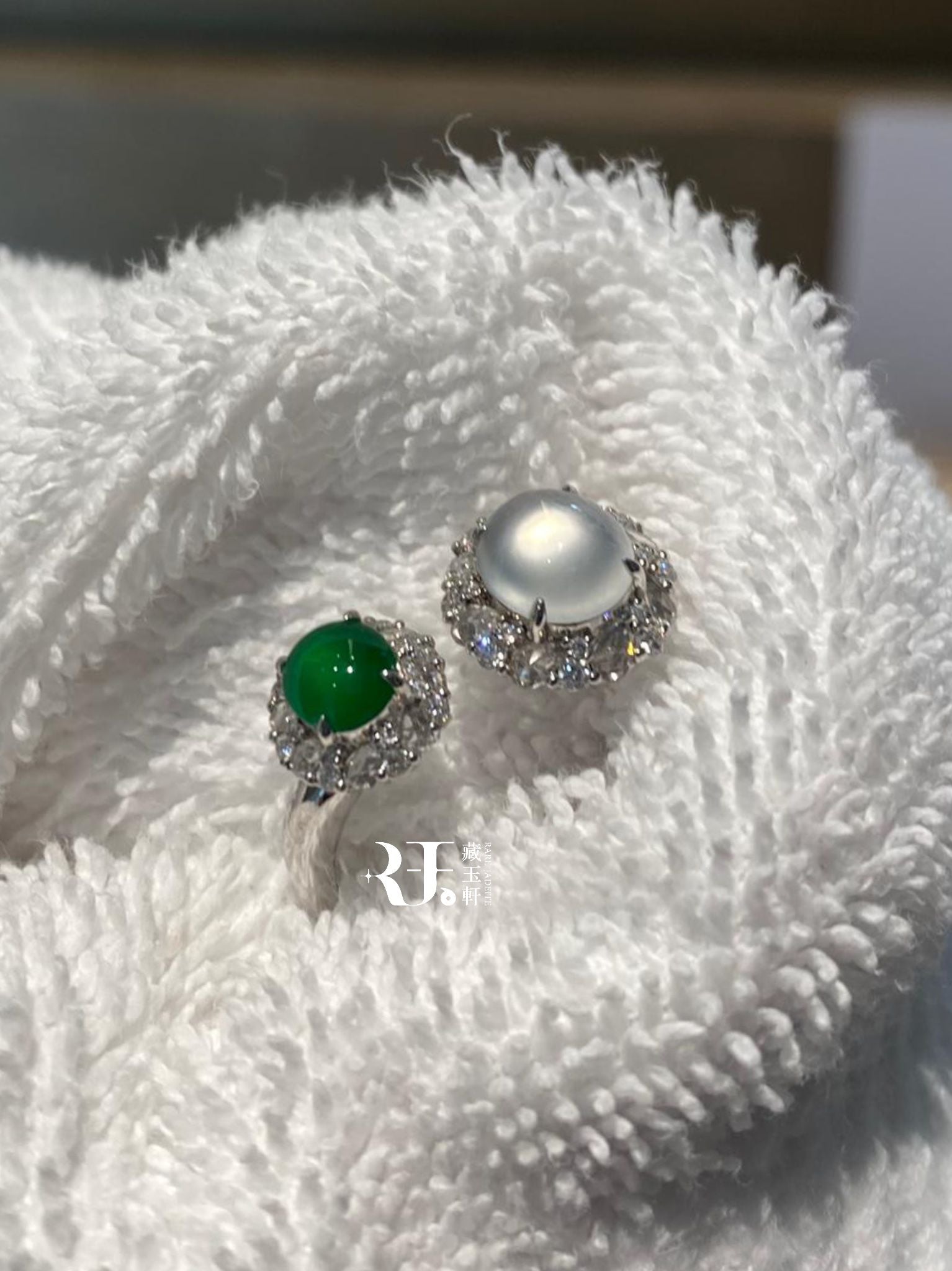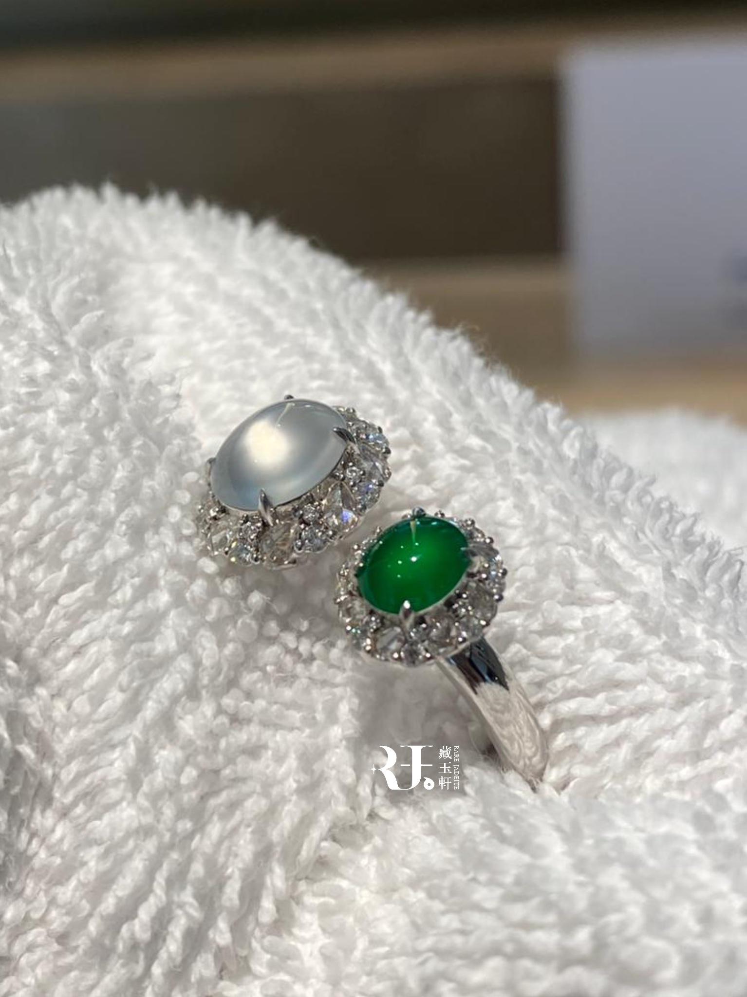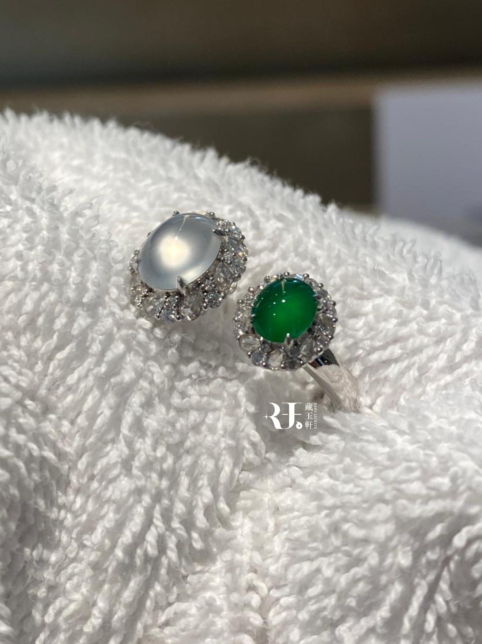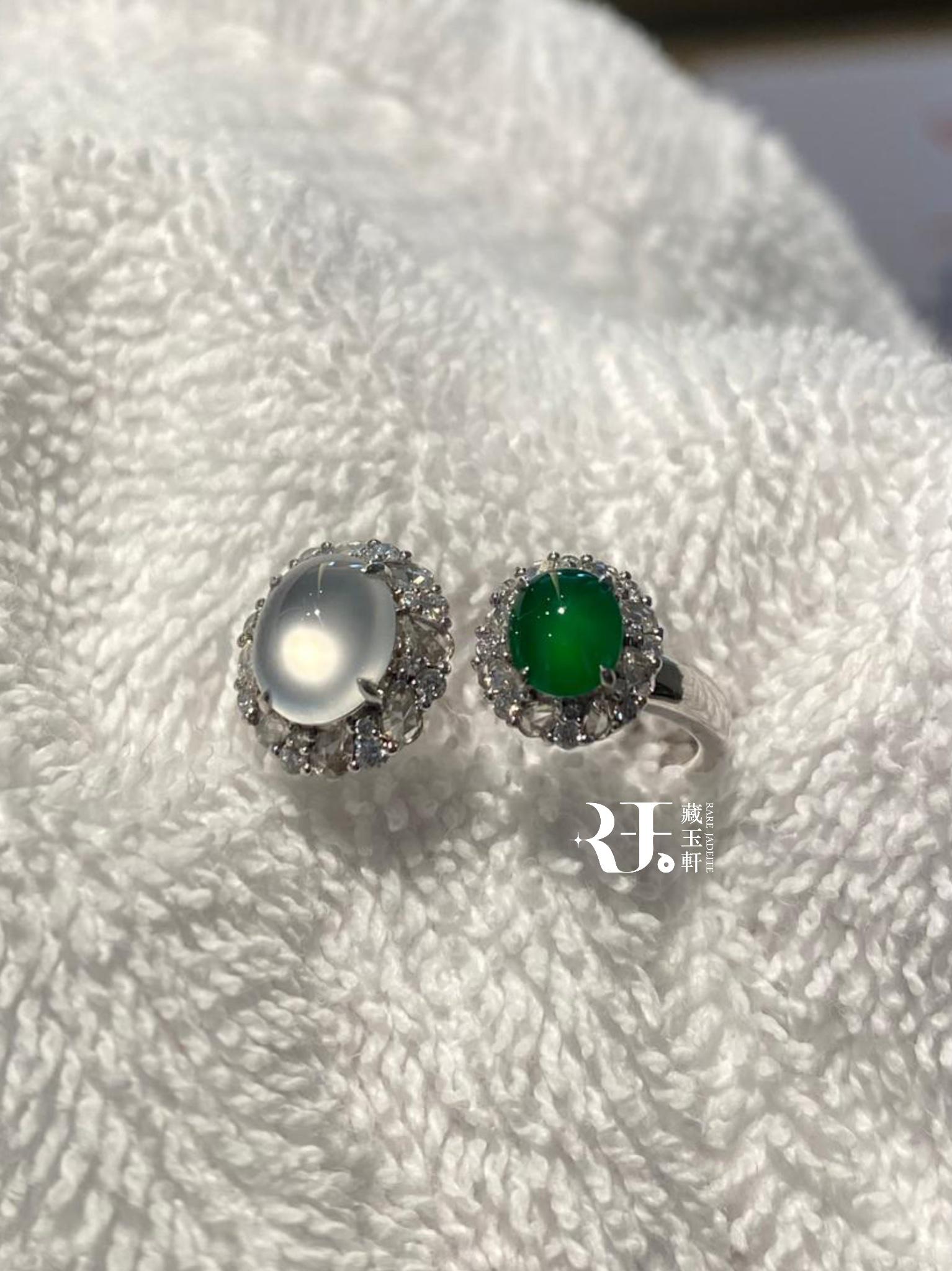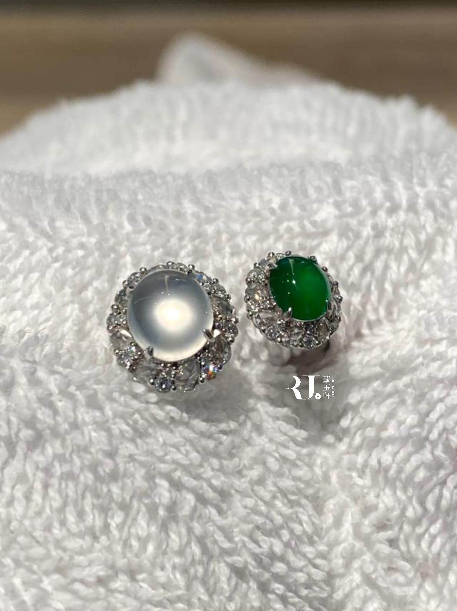 玉質種老細膩起螢起膠,一個裸石青翠明豔,一個裸石冰透水潤,顆顆玉質圓潤飽滿。