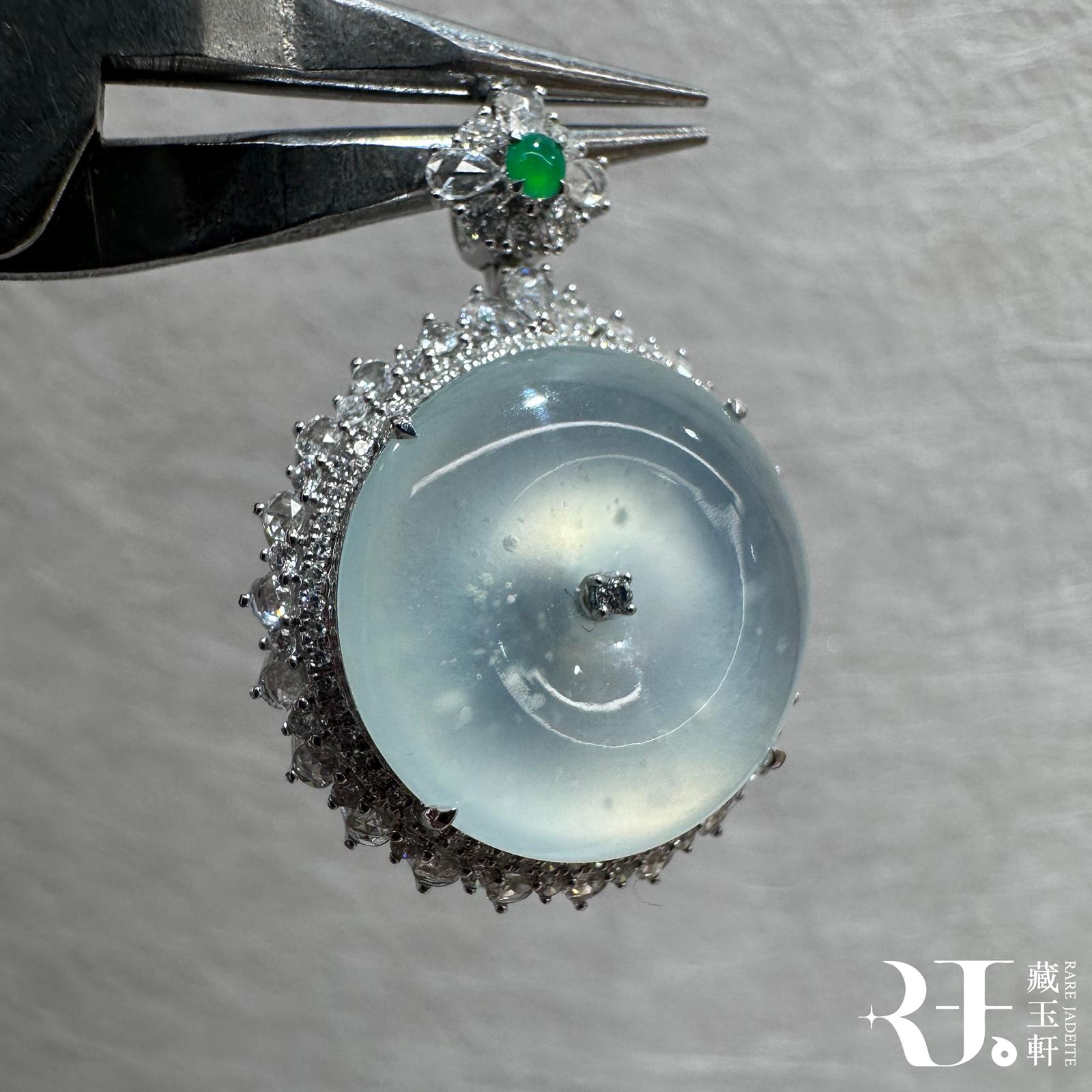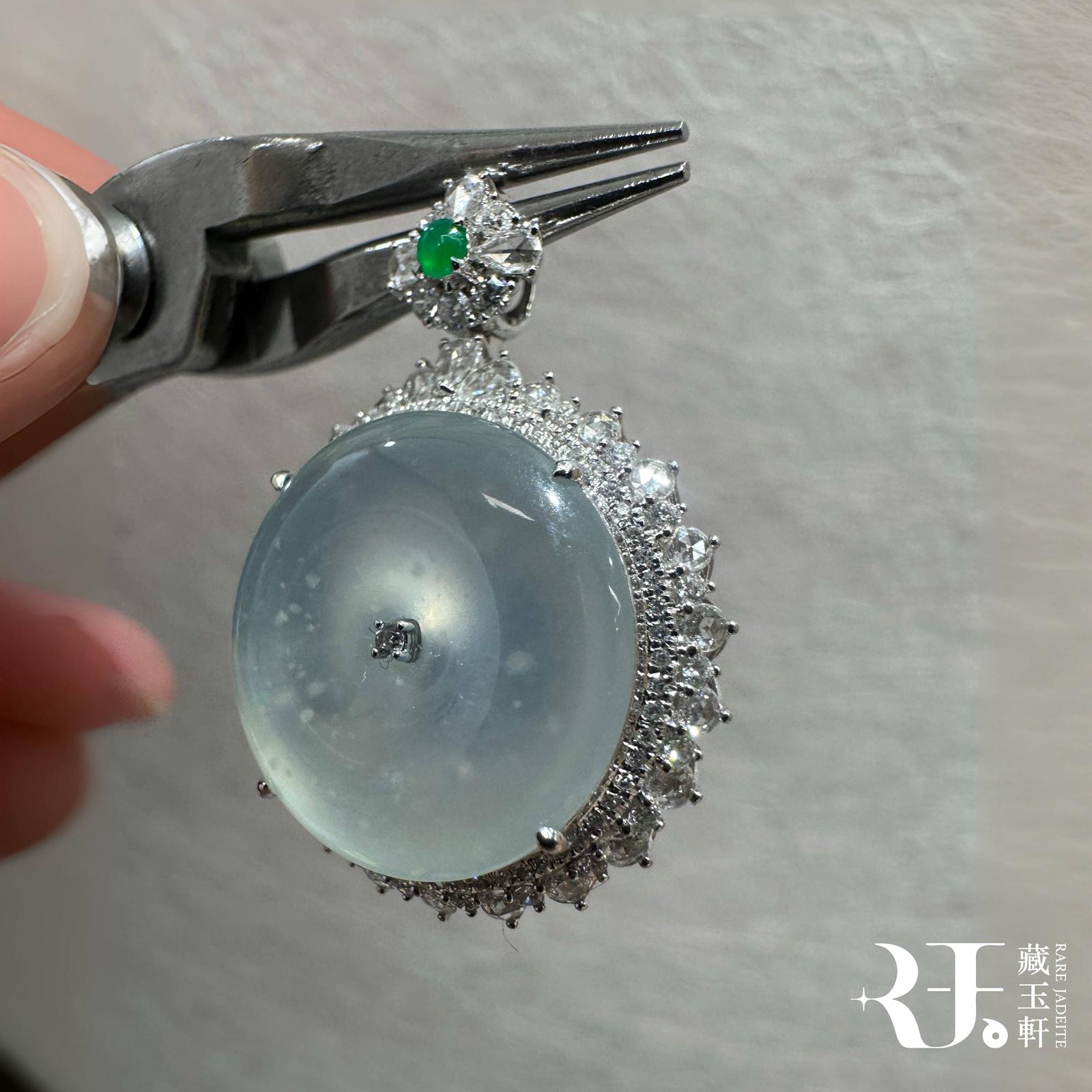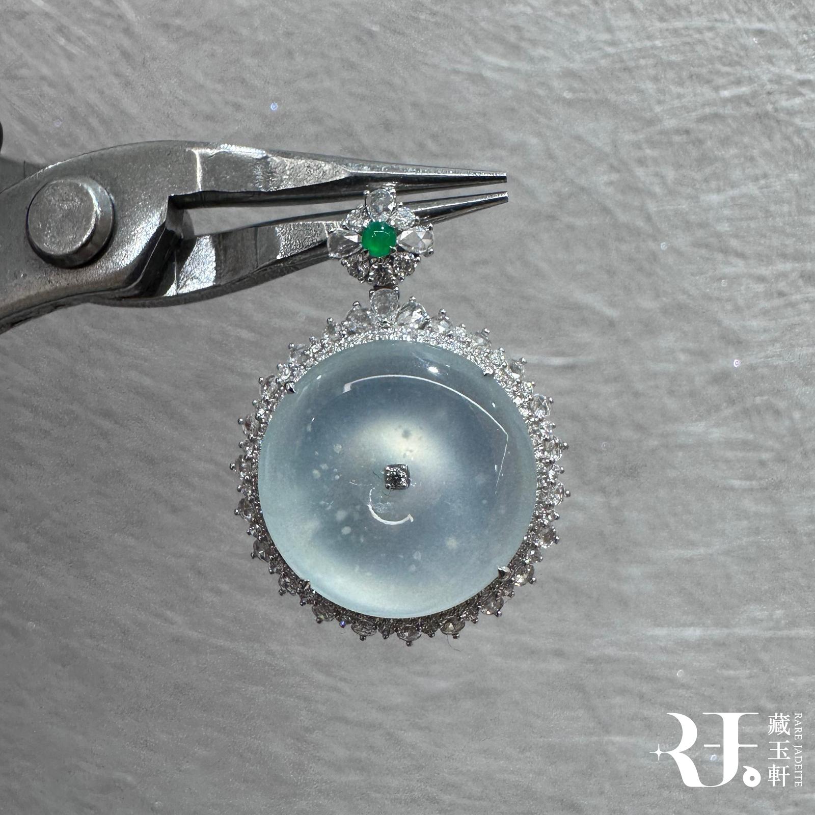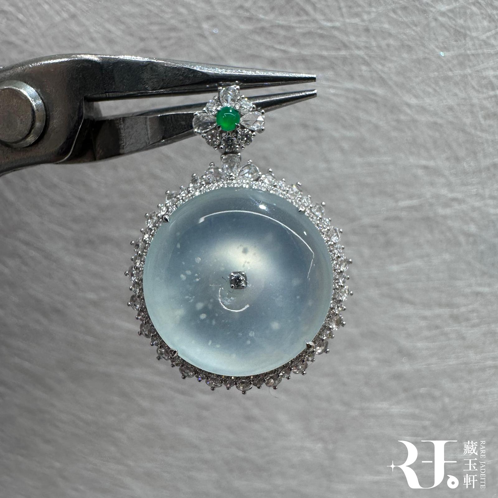 翡翠玉質通透無暇水潤,搭配18K金及鑽石圍鑲,上身大氣優雅。