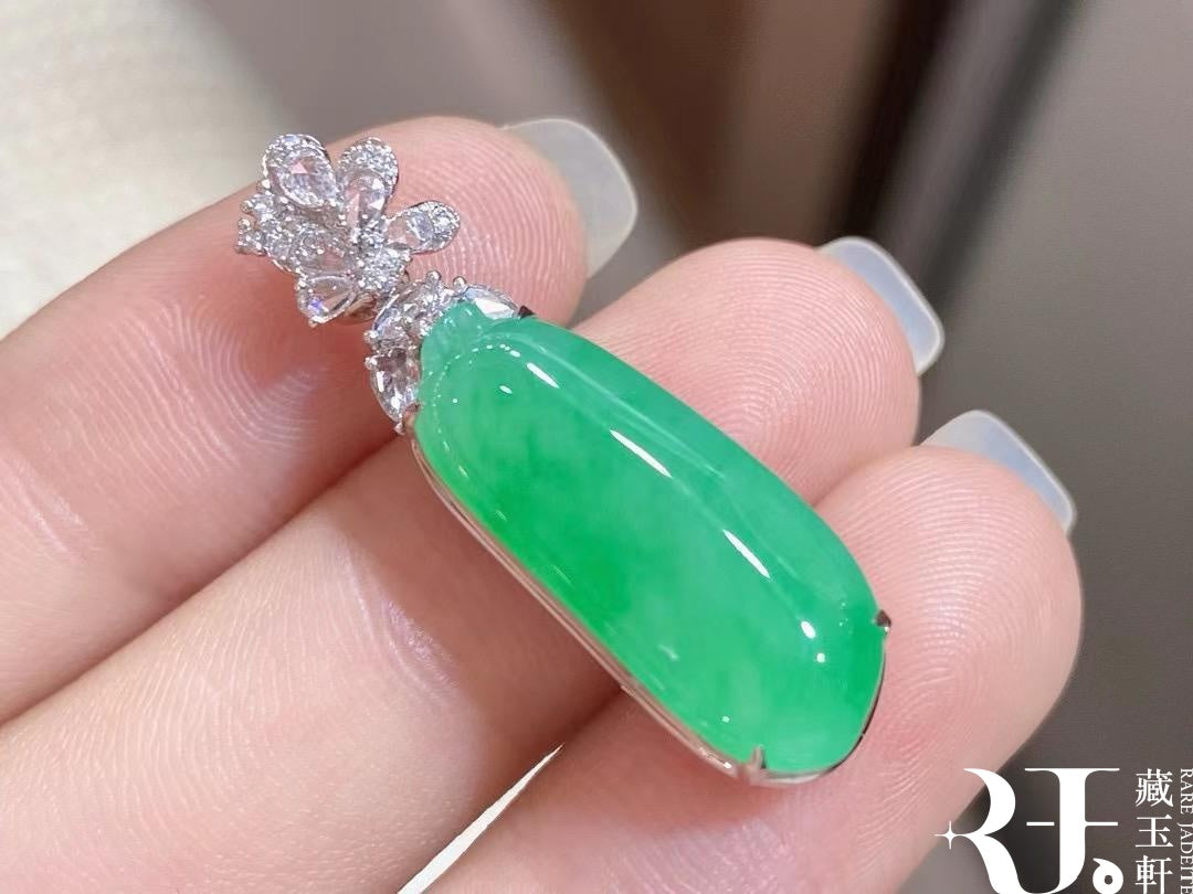 玉質種老細膩起螢起膠,裸石青翠明豔,玉質圓潤飽滿。