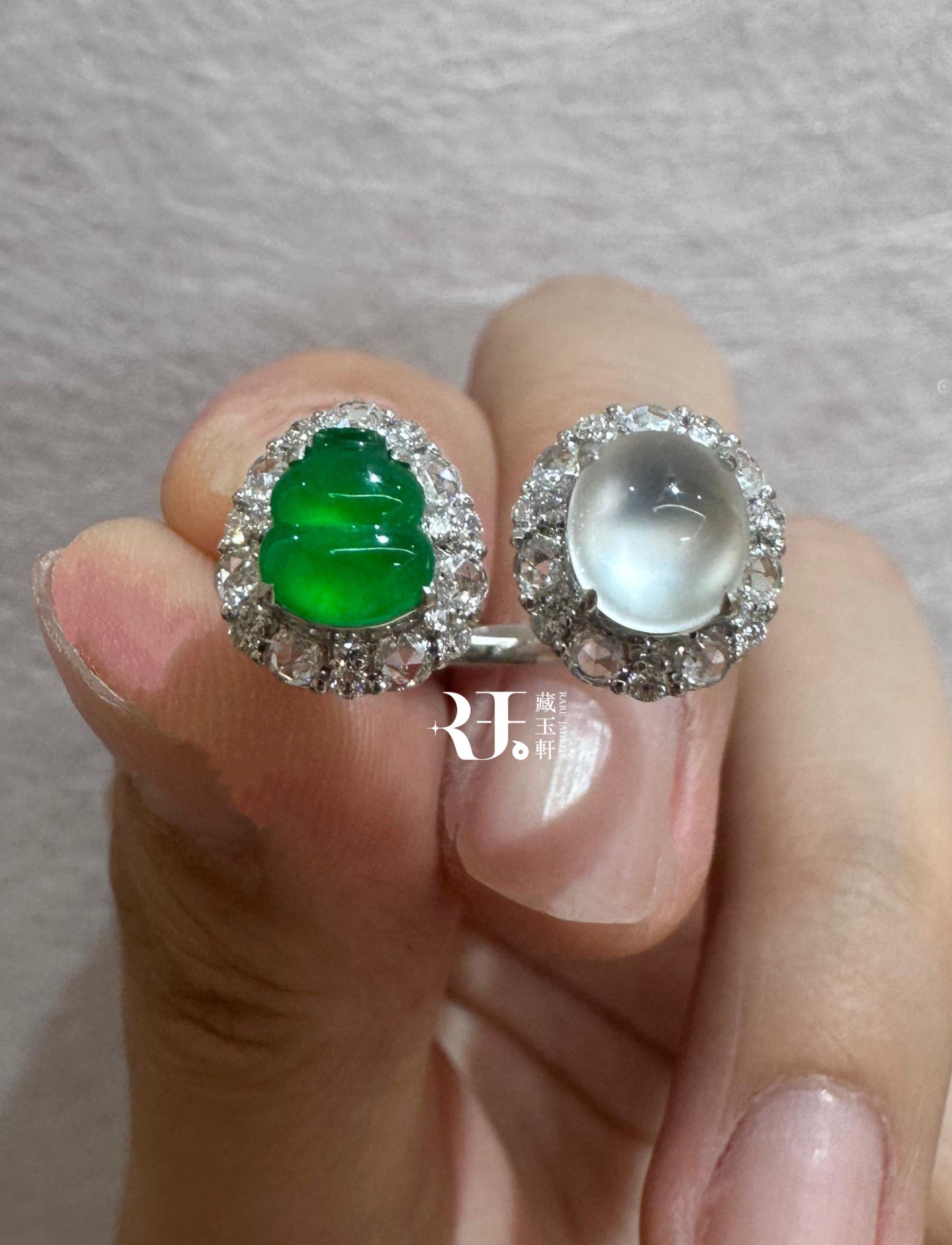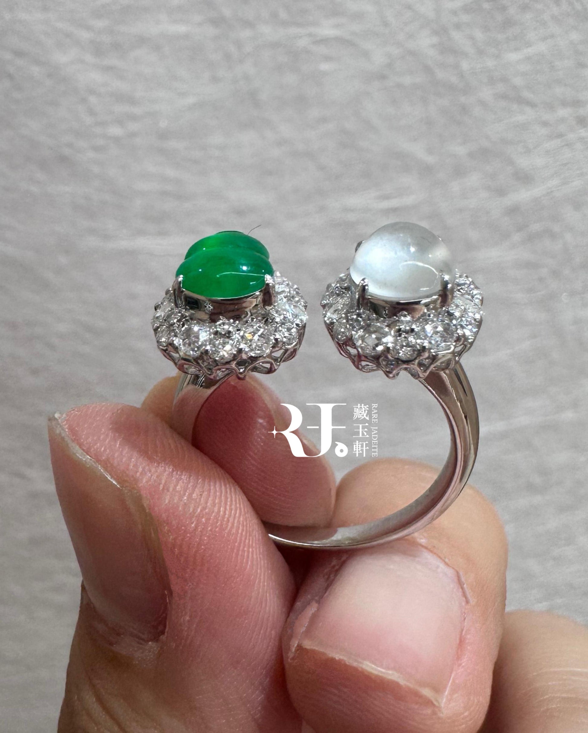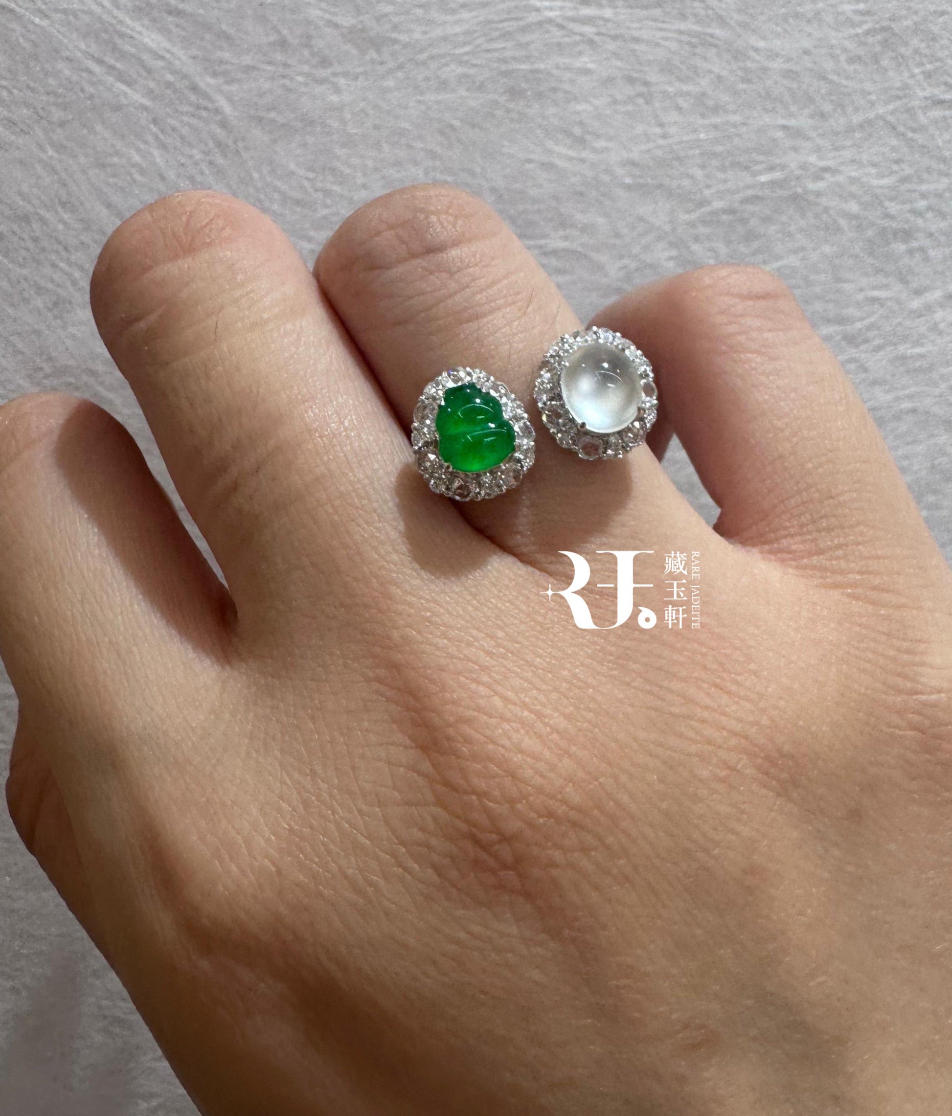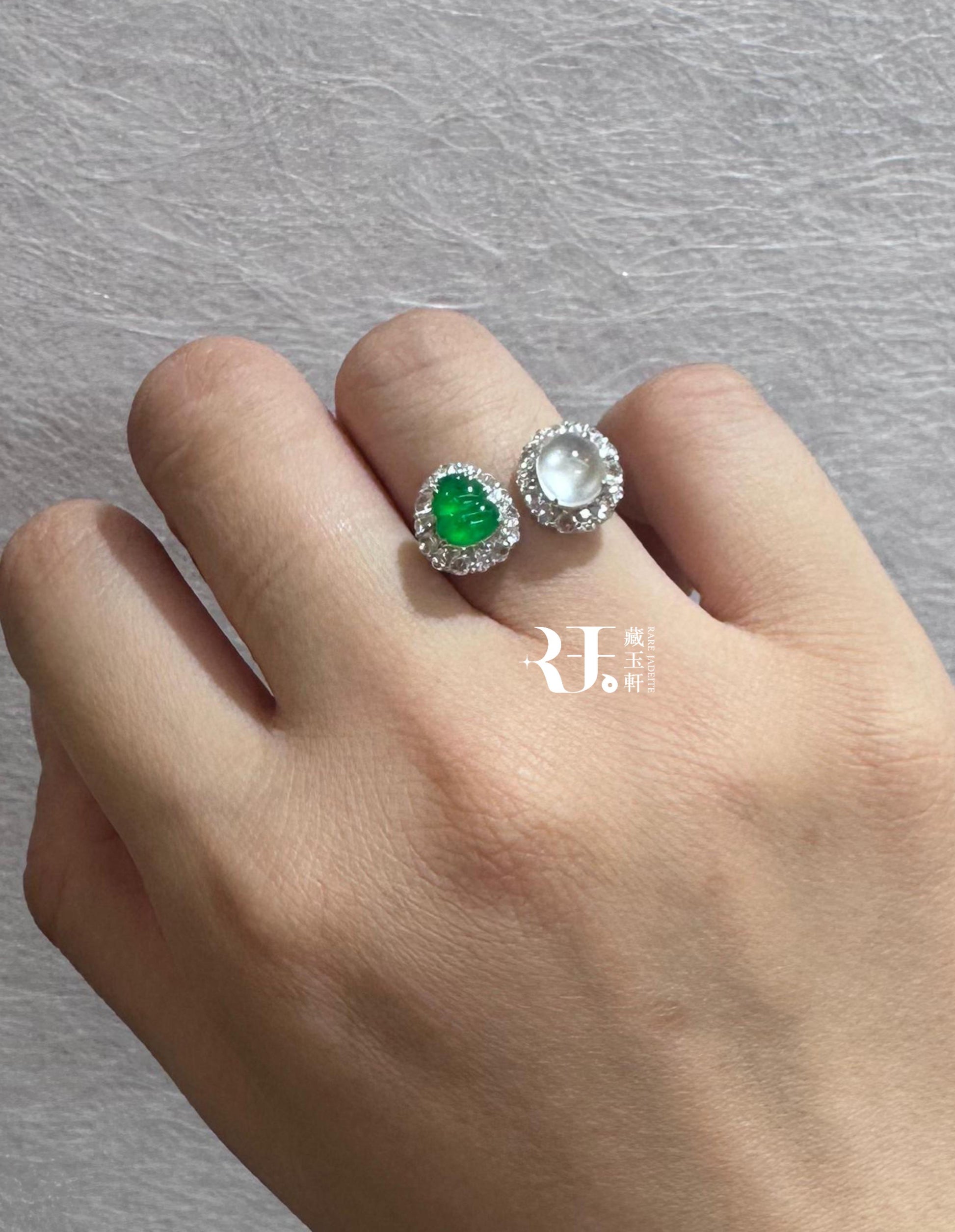 裸石青翠明豔,甜甜果陽綠色澤濃郁及茅台白冰,色好正濃,水頭足,起光起螢,葫型圓潤飽滿,開口戒指造型,搭配18K鑽石鑲嵌,氣質簡約 ,上手相當氣質驚豔,性價比非常高。
