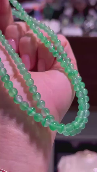 將珠串平行或將珠串扭轉對折加上連接扣變成Choker,也可其他材質項鍊與珠串疊搭,也能不同色澤翡翠疊搭,又美又時尚。