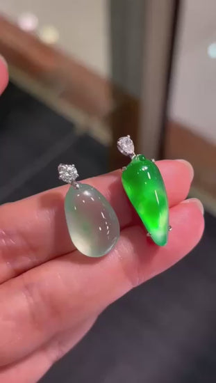 冰陽綠福瓜,水頭足,色濃新鮮,在擺動時泛寶石光芒。主石使用抓鑲固定。